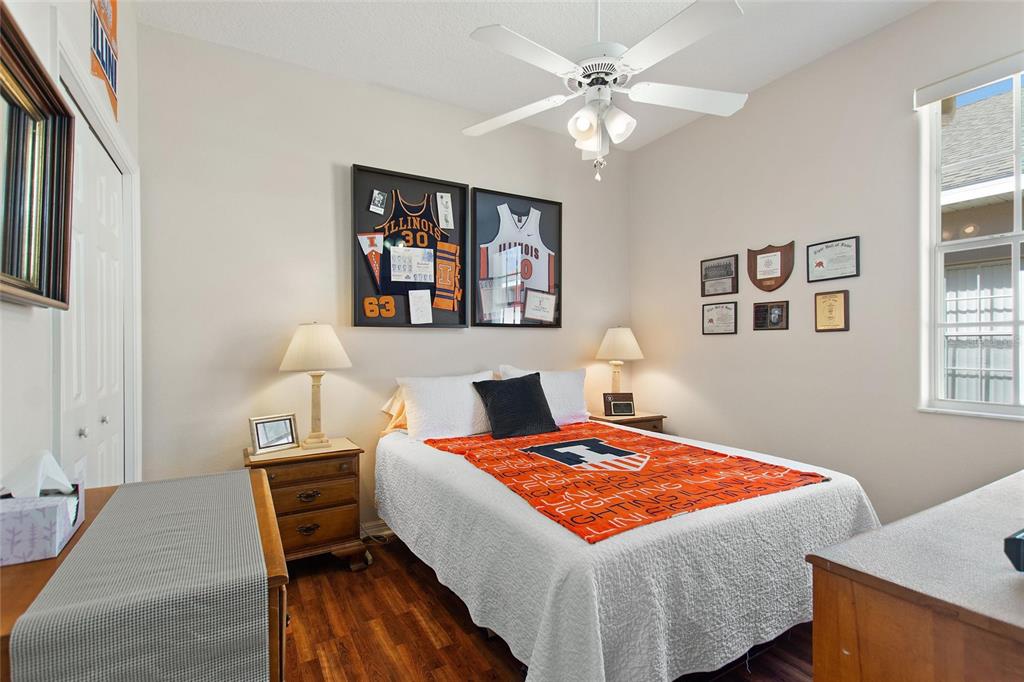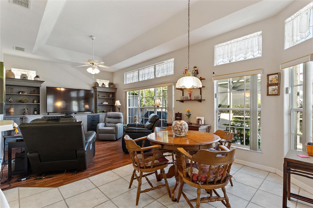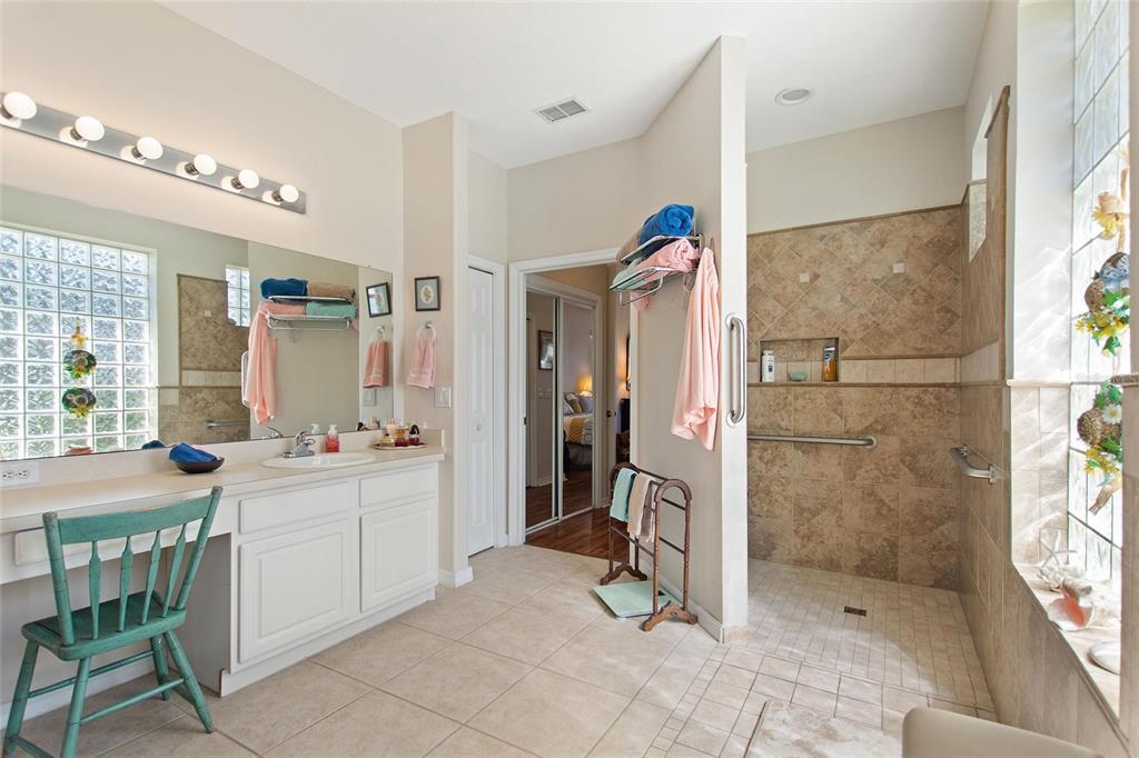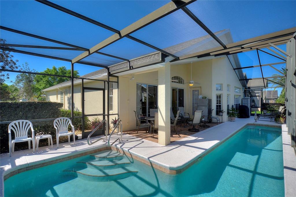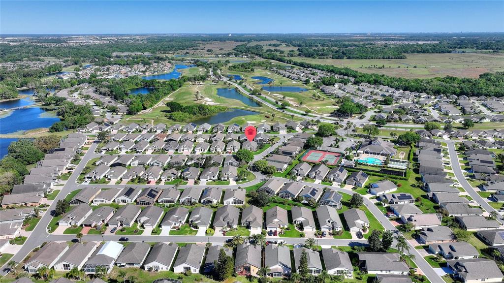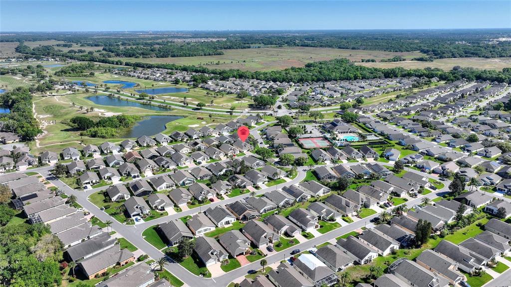 RidgeBrook 3/2/Den model on Corner Lot with New Roof in 2024, 22kW Generac Whole-House Generator, Solid Surface Floors, Tankless Hot Water Heater and a 950+ SF North-Facing Screened Lanai with Saltwater Pool, located 0.1 miles from High Vista’s private clubhouse and amenity center. Expanded driveway and walkway to an under-roof front entry with 8 FT Pella double front doors. Central great room with 12 FT ceilings and triple patio doors to pool deck. Cozy family room with custom California Closets built-in entertainment center and extended tray ceiling over dinette area. Galley kitchen has 42” cabinets upper cabinets with end-caps and under-lighting, Corian countertops, dovetailed drawers, ceramic tile backsplash, rollout out drawers in lower cabinets and stainless-steel appliances. Primary en suite bedroom has custom California Closets in the bathroom and the 6×4 lighted walk-in closet, patio door to pool deck, tray ceiling, built-in closet and an expansive bathroom with updated level-entry shower. Split bedroom design offers privacy to guests with a full bath and linen closet between 2 guest bedrooms with extra storage shelves in both closets. Bay window in front Den. California Closets custom built-in cabinets in laundry. Lighted L-shaped exercise pool with depths of 3-5 FT has corner waterfall. Garage has electric rolling screen door, utility sink, 5 installed overhead racks for storage and pull-down ladder access to attic with some flooring. 500 gallon buried propane tank for generator. Roof replaced 2024. Exterior painted 2023. Tankless hot water heater (2020), generator (2015), HVAC (2013) serviced annually. 3 wall-mounted TVs are included in sale. Select furnishings available for sale separately. Sold As-Is. Ridgewood Lakes is a golf cart friendly community. $230 monthly High Vista HOA fee includes Spectrum internet and basic cable TV with 2 cable boxes, lawn mowing and exclusive access to resident-owned 12,000 SF private clubhouse and amenities. $425 semi-annual Ridgewood Lakes HOA fee provides 24×7 staffed security gate and master association-owned private road maintenance. Adjacent to 18-hole White Heron Golf Club with restaurant, privately owned and open to the public. High Vista is a 55+ community with outdoor heated pool and spa, fitness center, library, pub & many organized activities. Pickle ball, tennis, bocce and shuffleboard courts. Miles of biking and walking trails within Ridgewood Lakes gated community. Shopping, Disney, Universal, Orlando & Central FL entertainment nearby, easy access to I-4, medical facilities, airports & Sunrail Station. Advent Health hospital is 3 miles away.