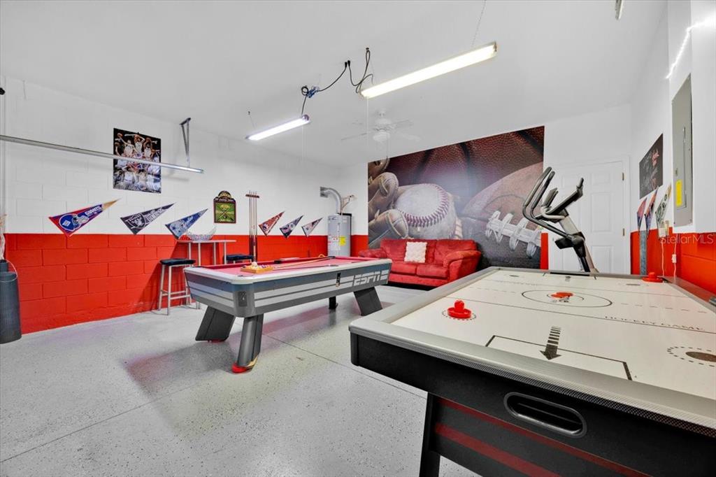 has been transformed into a game lounge with a pool table and air hockey, while the private