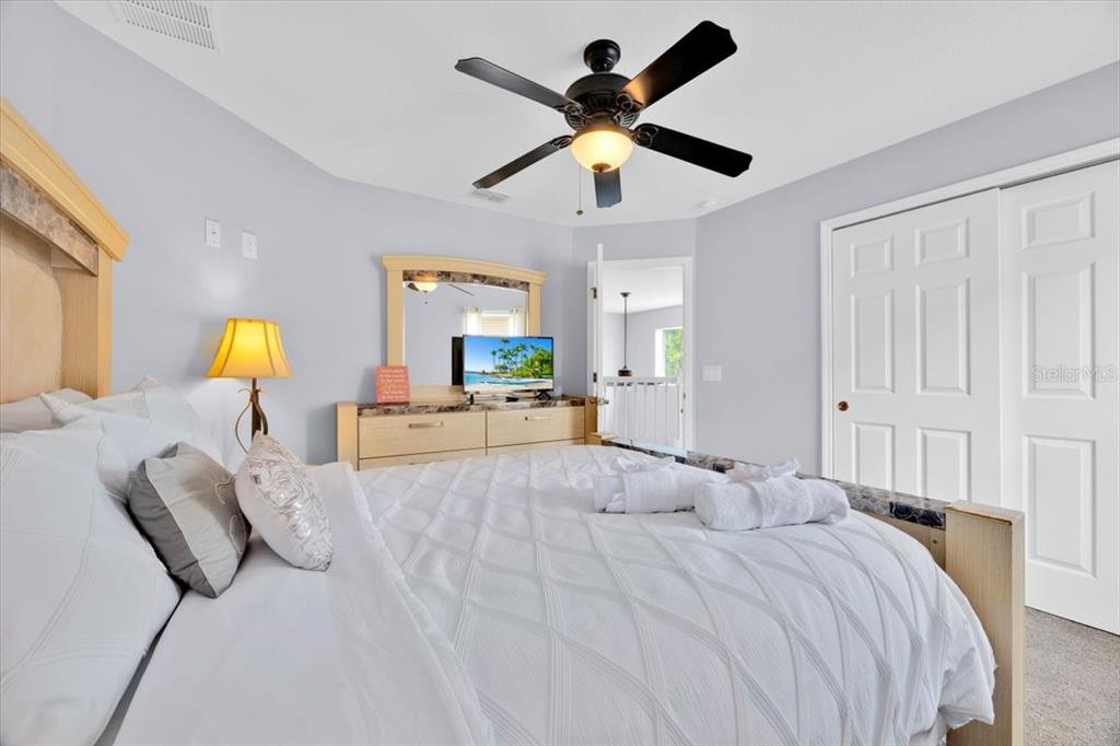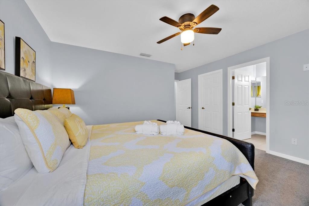 separate soaking tub and stand-up shower; upstairs, a second primary suite, a queen guest