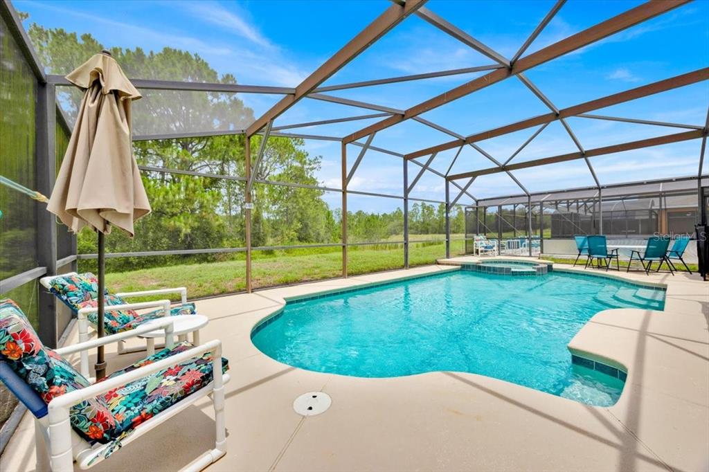 backyard features a heated pool and spa, lighting and a freshly painted deck—perfect for gentle