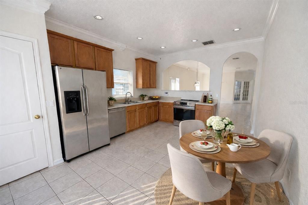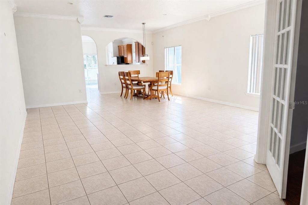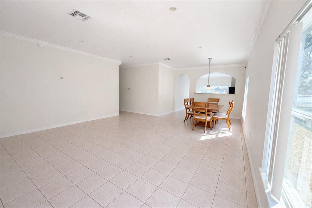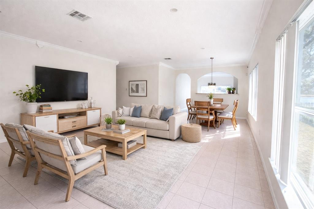 Inside, you will find an oversized combined living and dining area accented by elegant crown moulding and ceramic tile throughout the main living spaces, creating a polished, inviting setting that is perfect for both everyday living and entertaining. The bedrooms feature beautiful wood floors, and the upgraded bathrooms add a modern, refreshed feel to the home.