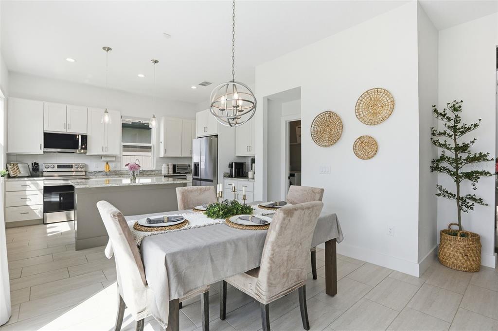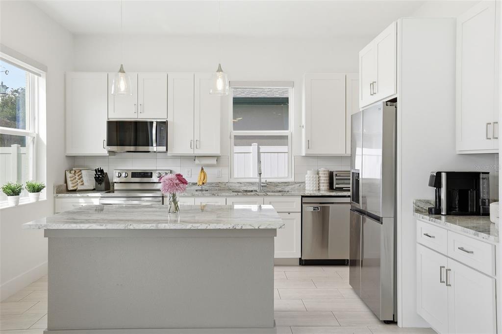 Step inside to a dramatic two-story foyer that opens into a bright and inviting floor plan designed for both everyday living and entertaining. The heart of the home is the beautifully appointed kitchen, featuring quartz countertops, shaker-style cabinetry, a microwave range hood, and bar seating, creating the perfect space for cooking, gathering, and hosting guests. Elegant pendant lighting and a statement chandelier add warmth and charm throughout the main living areas.