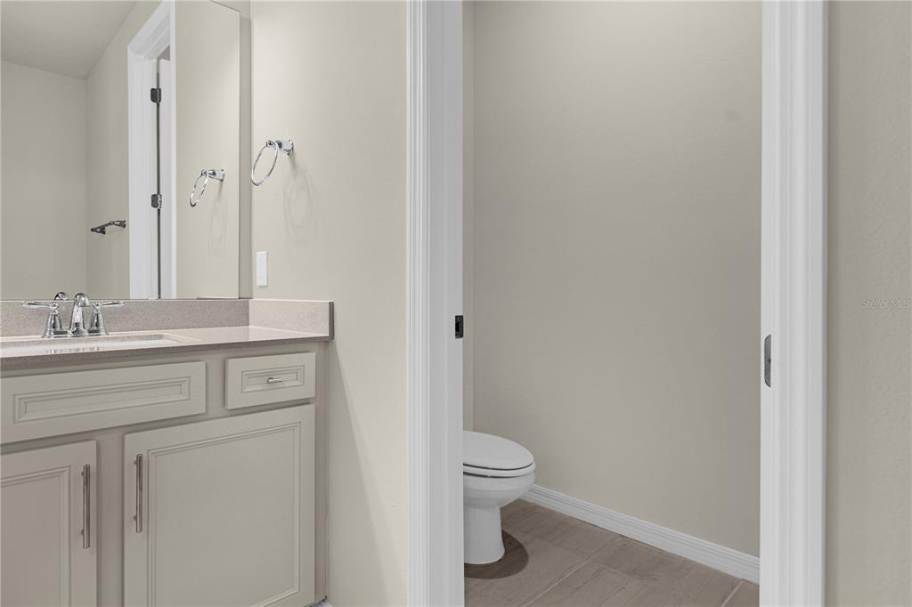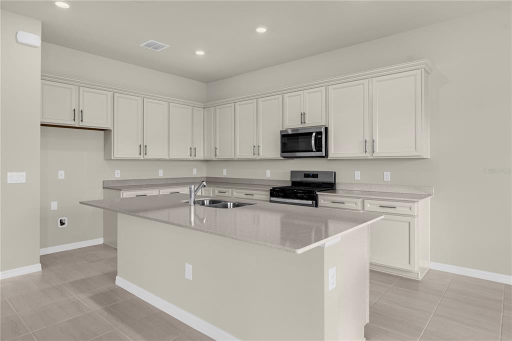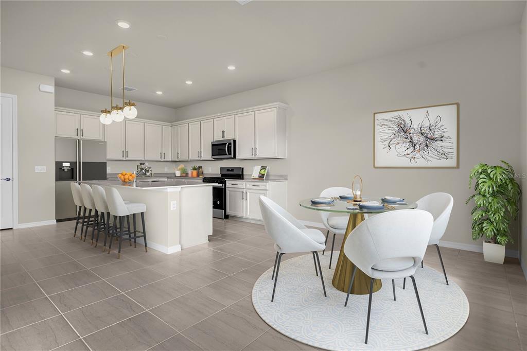 The gourmet chef’s kitchen features 42″ soft-close cabinetry, quartz countertops, and built-in Whirlpool stainless steel appliances including a natural gas cooktop and refrigerator. The kitchen flows into a cafĂ© and gathering room with a pocket sliding glass door opening to a lanai pre-plumbed for an outdoor kitchen — the ultimate indoor-outdoor living setup in Orlando’s unmatched lifestyle.