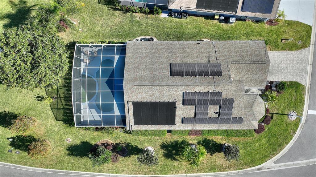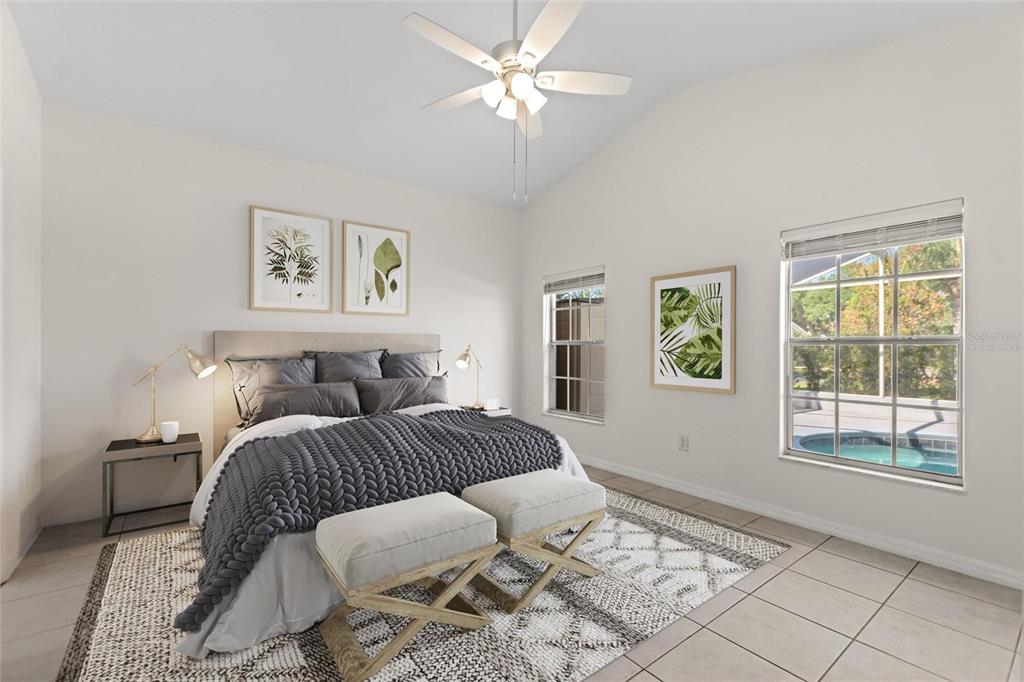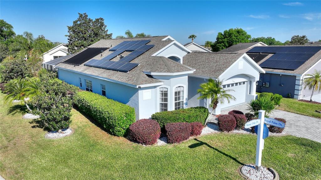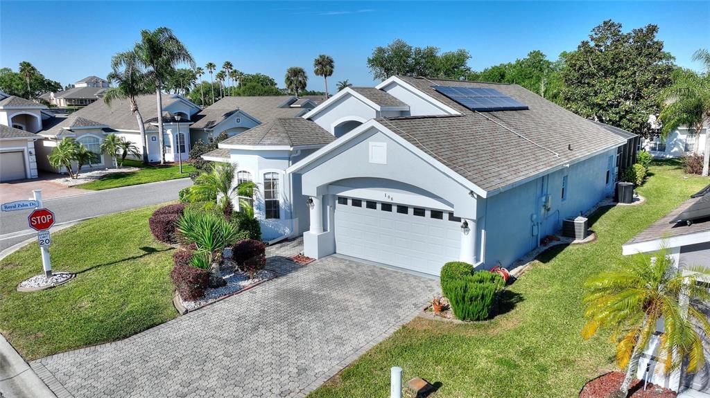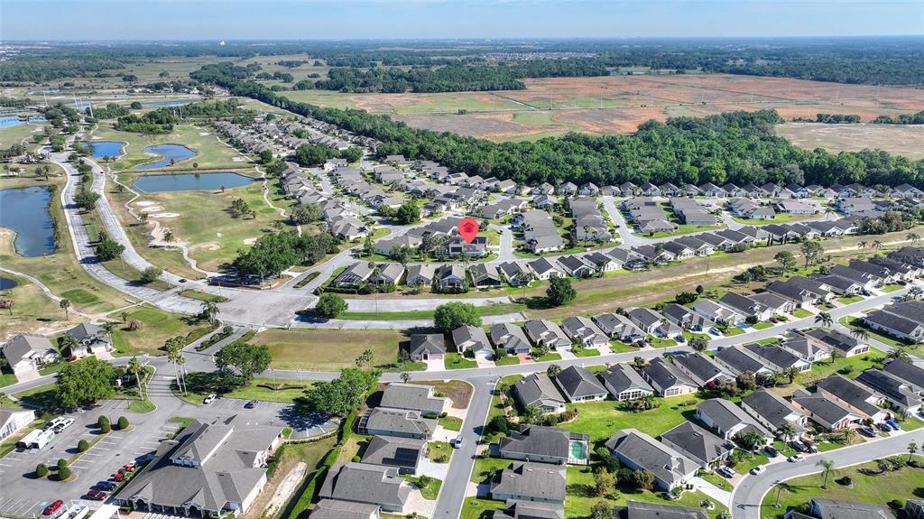 One or more photo(s) has been virtually staged. RidgeDale 3/2 with preferred bay window elevation, private pool, SunRun solar panels for low monthly electric bills, tile floors and an extended garage on a corner lot in High Vista’s active 55+ community. Current owner’s last 14-month average monthly electric bill was $86. Bright open central great room has 12 FT ceilings and a wall of patio doors leading to a nearly 1100 SF west-facing screened lanai and pool. Eat-in kitchen has Corian counters, breakfast bar & built-in desk, Bosch dishwasher, stainless-steel refrigerator & range, pantry and storage closet. Cathedral ceiling in primary bedroom with full private bath, linen closet, double sink vanity and 6×6 walk-in closet. Split bedroom design offers a cozy guest area with adjacent full bath and linen closet between guest rooms. Corridor garage-access laundry room with washer & dryer has storage closet and utility sink. Garage has pull-down ladder access to attic, opener with keypad entry and extra refrigerator. Current owner replaced water heater in 2025, painted exterior and interior in 2022, replaced window blinds, ceiling fans & lighting and installed full-view front storm door with integrated rolling screen. Prior owner replaced pool heater in 2019 and roof in 2018. Solar panels are leased; buyer must apply for SunRun credit approval and sign transfer of Sunrun Solar Service Agreement. Sold As-Is. Ridgewood Lakes is a golf cart friendly community. $230 monthly High Vista HOA fee includes Spectrum internet and basic cable TV with 2 cable boxes, lawn mowing and exclusive access to resident-owned 12,000 SF private clubhouse and amenities. $425 semi-annual Ridgewood Lakes HOA fee provides 24×7 staffed security gate and master association-owned private road maintenance. Adjacent to 18-hole White Heron Golf Club with restaurant, privately owned and open to the public. High Vista is a 55+ community with outdoor heated pool and spa, fitness center, library, pub & many organized activities. Pickle ball, tennis, bocce and shuffleboard courts. Miles of biking and walking trails within Ridgewood Lakes gated community. Shopping, Disney, Universal, Orlando & Central FL entertainment nearby, easy access to I-4, medical facilities, airports & Sunrail Station. Advent Health hospital is 3 miles away.