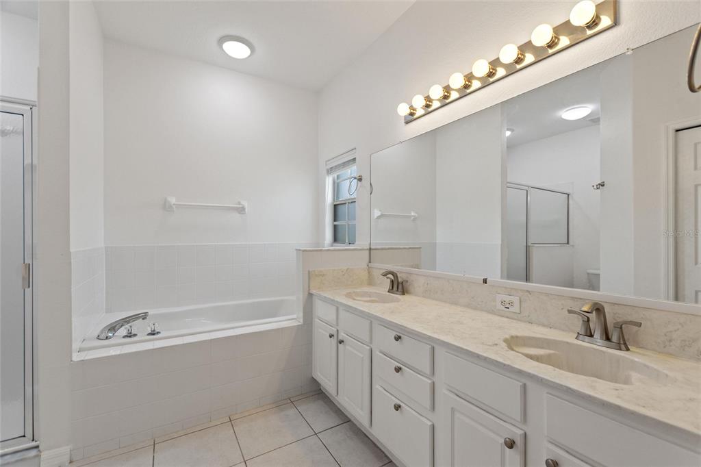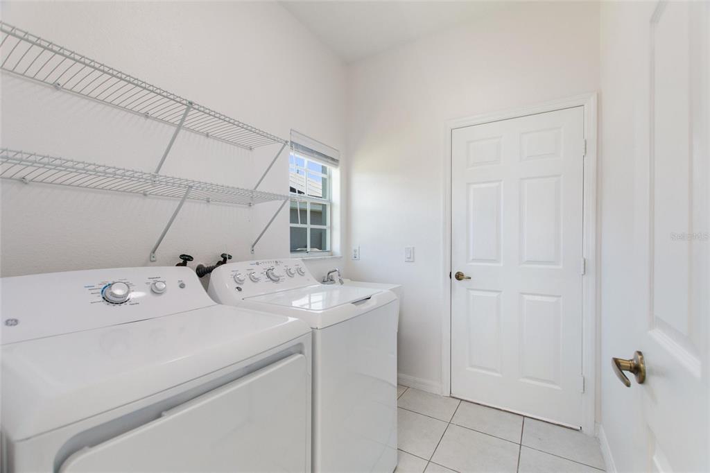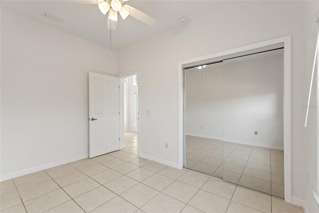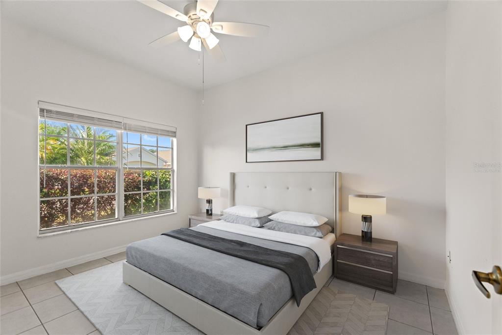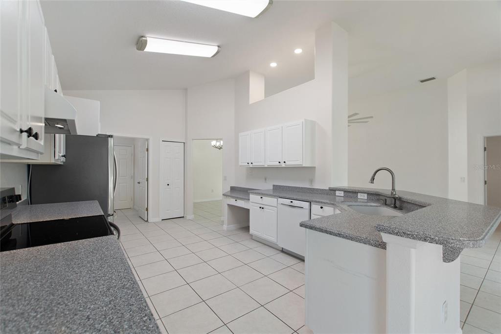 One or more photo(s) has been virtually staged. RidgeDale 3/2 with preferred bay window elevation, private pool, SunRun solar panels for low monthly electric bills, tile floors and an extended garage on a corner lot in High Vista’s active 55+ community. Current owner’s last 14-month average monthly electric bill was $86. Bright open central great room has 12 FT ceilings and a wall of patio doors leading to a nearly 1100 SF west-facing screened lanai and pool. Eat-in kitchen has Corian counters, breakfast bar & built-in desk, Bosch dishwasher, stainless-steel refrigerator & range, pantry and storage closet. Cathedral ceiling in primary bedroom with full private bath, linen closet, double sink vanity and 6×6 walk-in closet. Split bedroom design offers a cozy guest area with adjacent full bath and linen closet between guest rooms. Corridor garage-access laundry room with washer & dryer has storage closet and utility sink. Garage has pull-down ladder access to attic, opener with keypad entry and extra refrigerator. Current owner replaced water heater in 2025, painted exterior and interior in 2022, replaced window blinds, ceiling fans & lighting and installed full-view front storm door with integrated rolling screen. Prior owner replaced pool heater in 2019 and roof in 2018. Solar panels are leased; buyer must apply for SunRun credit approval and sign transfer of Sunrun Solar Service Agreement. Sold As-Is. Ridgewood Lakes is a golf cart friendly community. $230 monthly High Vista HOA fee includes Spectrum internet and basic cable TV with 2 cable boxes, lawn mowing and exclusive access to resident-owned 12,000 SF private clubhouse and amenities. $425 semi-annual Ridgewood Lakes HOA fee provides 24×7 staffed security gate and master association-owned private road maintenance. Adjacent to 18-hole White Heron Golf Club with restaurant, privately owned and open to the public. High Vista is a 55+ community with outdoor heated pool and spa, fitness center, library, pub & many organized activities. Pickle ball, tennis, bocce and shuffleboard courts. Miles of biking and walking trails within Ridgewood Lakes gated community. Shopping, Disney, Universal, Orlando & Central FL entertainment nearby, easy access to I-4, medical facilities, airports & Sunrail Station. Advent Health hospital is 3 miles away.