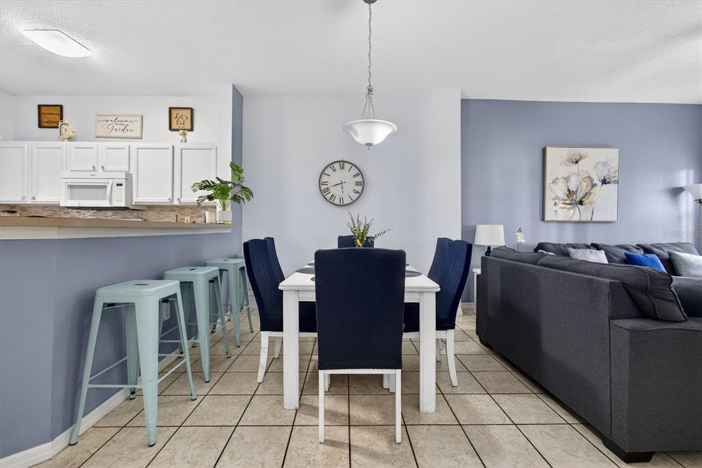 The home features a bright and spacious open-concept living and dining area with tile flooring throughout the main level, creating an inviting environment for relaxing or entertaining. The well-equipped kitchen offers ample cabinetry and a convenient breakfast bar, ideal for casual dining or gathering with guests.