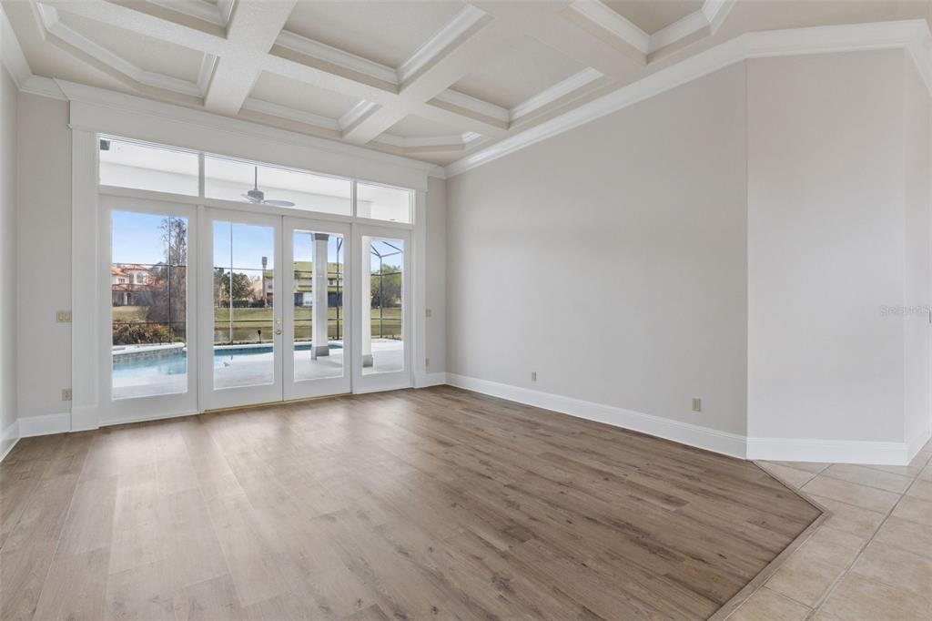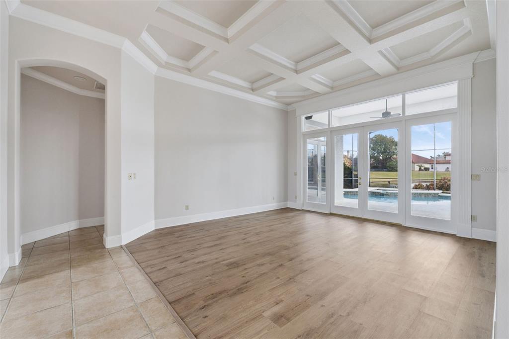The seamless floor plan transitions effortlessly from formal living and dining rooms into relaxed gathering spaces, all framed by natural light and serene views of the screened pool and tranquil pond beyond. Whether hosting holidays, intimate gatherings, or quiet evenings at home, the layout adapts beautifully.