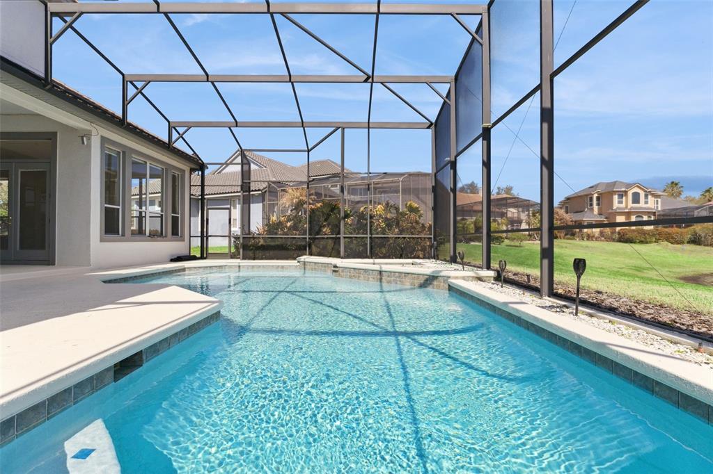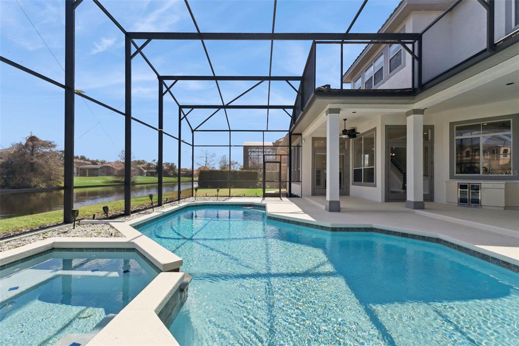 Outdoors, the screened pool overlooks a tranquil pond, delivering privacy, water views, and a backdrop that elevates both quiet mornings and lively evenings.