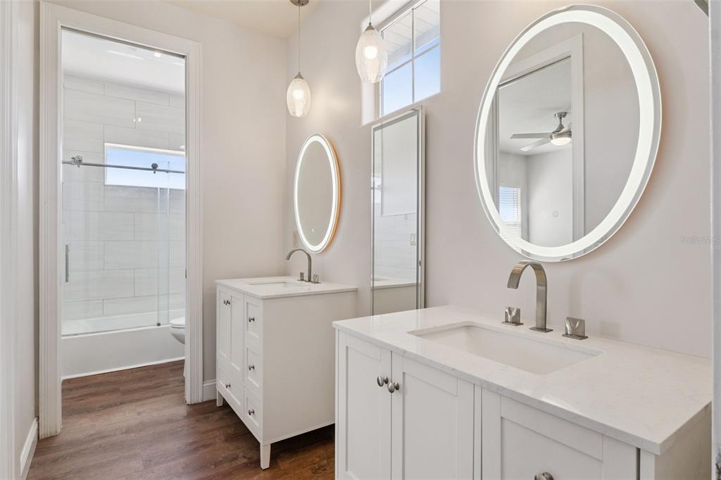 The expansive primary suite is discreetly situated on the first floor and easily accommodates a dedicated sitting area. The spa-inspired en-suite bath offers double vanities with a private vanity seating area, a garden soaking tub, and a separate walk-in shower, creating a luxurious space for relaxation and daily preparation.