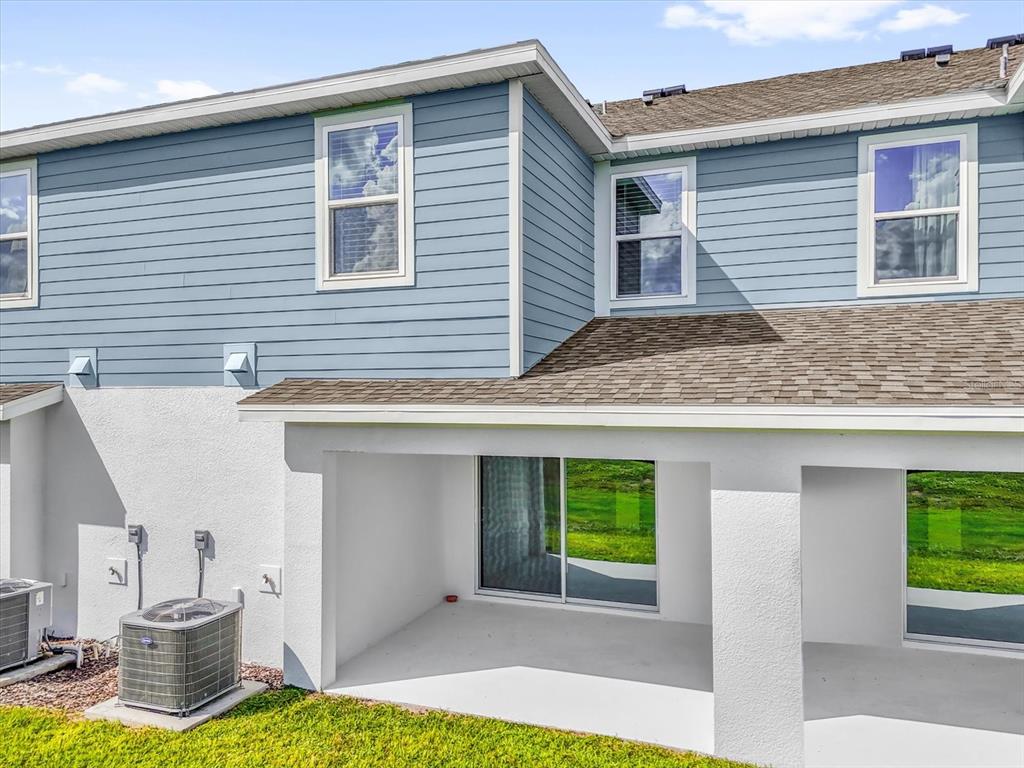 The main level flows seamlessly into the living and dining area, creating an inviting space with natural light. Upstairs you’ll find **NEW laminate flooring on the staircase and hallway** (NO CARPET downstairs) leading to bedrooms and a spacious primary suite. Enjoy outdoor living on the extended rear patio lanai overlooking open green space with NO REAR NEIGHBORS, offering added privacy and a peaceful setting.