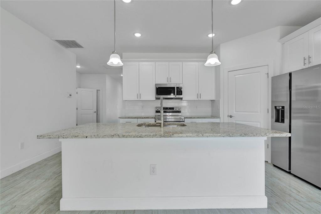Step inside to a bright and welcoming open-concept floor plan highlighted by an impressive entry hallway, soaring 9’2″ ceilings, and elegant porcelain tile flooring throughout. The beautifully designed kitchen serves as the heart of the home, featuring granite countertops, a spacious center island with breakfast bar seating, stylish cabinetry, stainless steel appliances, and a walk-in pantry. The kitchen flows seamlessly into the dining and living areas, creating an ideal space for both entertaining and everyday living.
