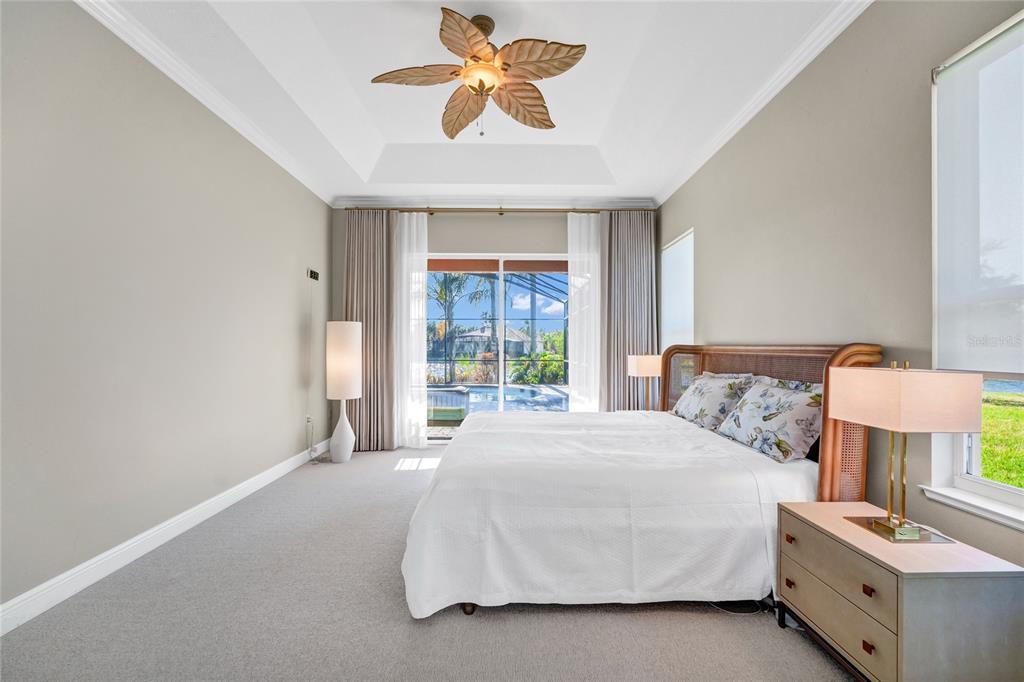 The outdoor living space is a true showpiece, showcasing a custom oversized solar-heated pool with three fountains, in-pool sun shelf, expansive covered and open patio areas, and a large screened lanai. Lush tropical landscaping with Belgium block pavers, mature palms, pergola accents, and serene lakefront sunset views create a private resort-style retreat ideal for entertaining or relaxing.