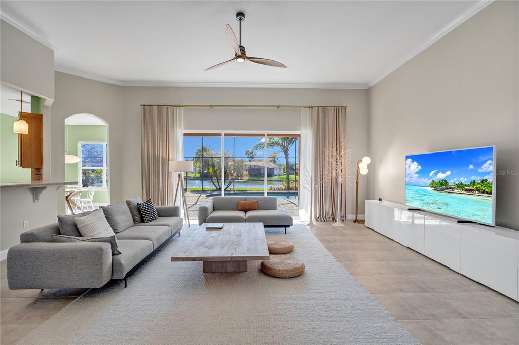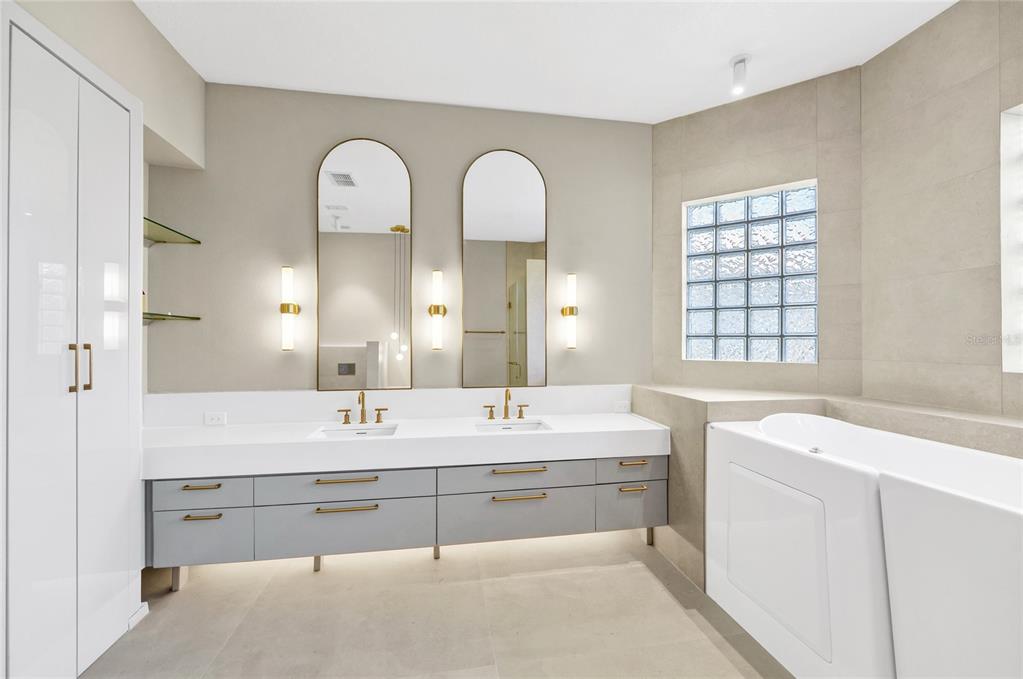 Experience grand lakefront living in this former model, fully furnished 3-bedroom, 2-bath estate home located on a quiet cul-de-sac in the highly desirable Solivita. Boasting over $165,000 in professional upgrades, this meticulously maintained, move-in-ready residence offers the ultimate turnkey opportunity. The home features fully renovated primary and guest bathrooms with spa-style finishes including premium Kohler fixtures, Porcelanosa tile, towel warmers, designer lighting, custom vanities, ADA accessibility features, and an impressive walk-through shower with spa jets.