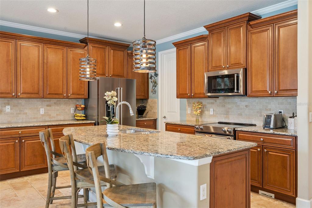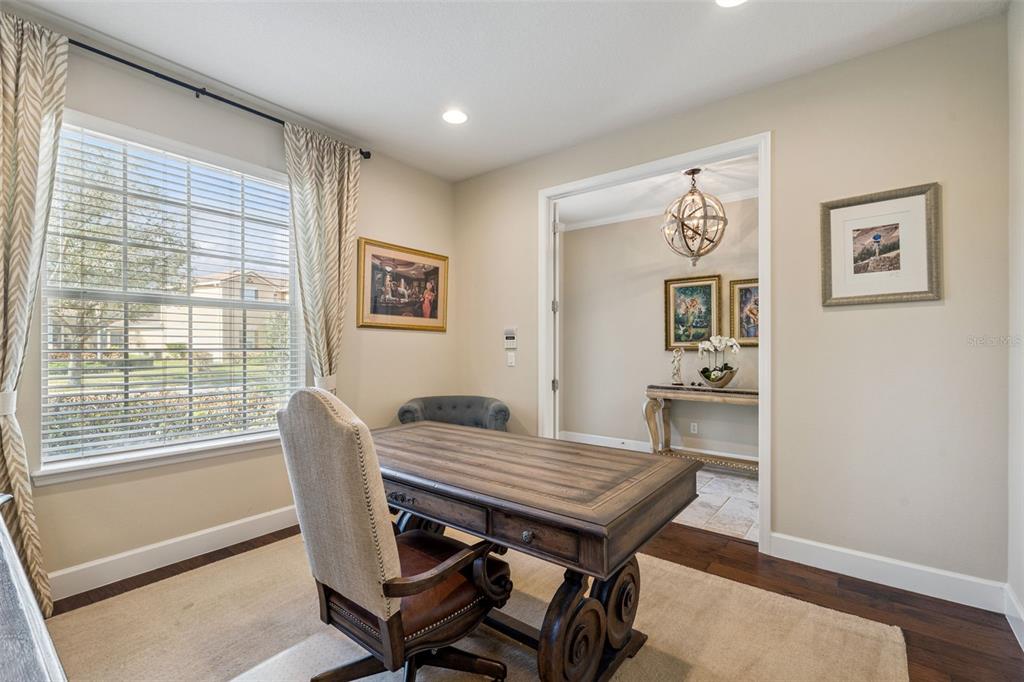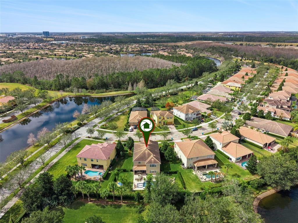 This expansive and beautifully upgraded two-story pool home in the heart of Lake Nona is looking for a new homeowner. Step inside to a welcoming foyer that leads to a private front office with wood flooring, creating an inviting workspace that promotes productivity in a work-from-home setting. The large porcelain tile in the foyer is carried into the dining area with a neutral wall palette and crown molding details creating an ideal setting for formal gatherings. A versatile first floor bedroom is tucked off a short hallway with convenient access to a full bath, making it ideal for guests or accommodating multigenerational living. A large living room, where natural light pours in through expansive windows, flows seamlessly into a modern kitchen equipped with a spacious pantry, an island ideal for casual dining, a built-in wine storage, and a beverage fridge. Adjacent to the kitchen, a built-in desk area serves as a functional homework station or additional workspace. The custom staircase features dark wood treads, beautifully designed mosaic tile risers, upgraded wood handrails, and wrought iron balusters. At the top, you’ll find a generous sized space that can be transformed into a game room or a secondary living area, providing endless possibilities to suit your needs. The sprawling primary suite is complemented by well-dressed primary bath that boasting dual vanities with modern fixtures, multiple closets, a luxurious walk-in shower with a built-in bench,and a large soaking tub. Two additional bedrooms provide a cozy sanctuary, each with soft, plush carpet. A shared full bathroom and a conveniently located laundry room is designed for everyday functionality, complete with modern appliances and storage solutions. Step outside to the covered patio that provides a stunning view of your fenced private backyard oasis. The saltwater pool was expertly installed in 2024 and a fully functional outdoor kitchen with everything you need for a cookout. Patio speakers fill the air with music, while the fire pit becomes the focal point of cozy gatherings under the stars. This residence was designed for comfort and convenience with two AC units, including one of them replaced in 2024, a new water heater installed in 2024, and a built-in central vacuum system. A whole-home surround sound system elevates both indoor and outdoor entertaining experiences, while the two-car garage features durable epoxy flooring, rounding out the home’s impressive upgrades. VillageWalk at Lake Nona is a thoughtfully designed master-planned community that offers the ultimate in resort-style living. Waling bridges with scenic canals wind through the neighborhood, connecting residents to a variety of on-site amenities, including a deli, a gas station, and a vibrant town center. Outdoor enthusiasts will enjoy lighted sports courts, and heated swimming pools, while the 24-hour fitness center supports an active lifestyle. Just minutes away is Lake Nona Town Center, a dynamic 100-acre open-air destination featuring public art displays, upscale shopping, hotels such as the iconic Lake Nona Wave Hotel, and Boxi Park. Families benefit from access to top-rated A-rated schools, and the community’s prime location near Medical City and Orlando International Airport makes travel seamless. World-famous attractions like Disney, SeaWorld, and Universal Studios are just a short drive away. HOA fees include lawn care, high-speed internet, and cable, ensuring truly hassle-free living.