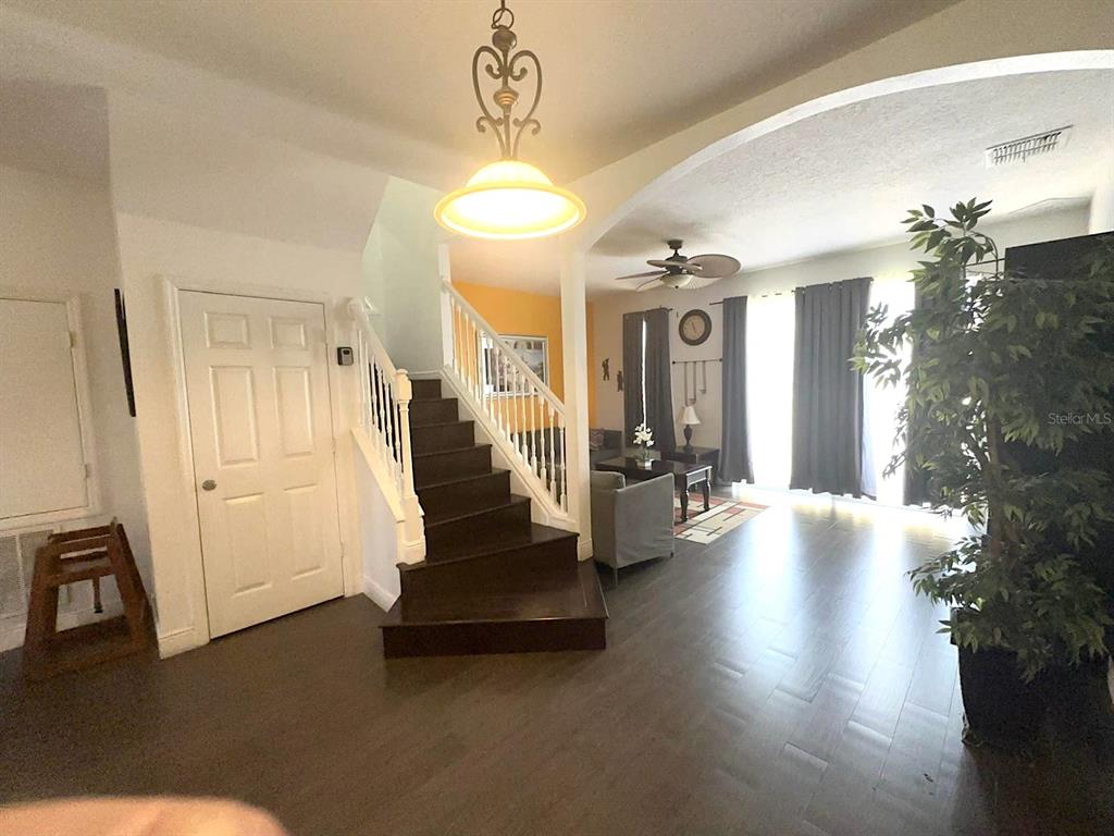 The open-concept first floor features ceramic tile throughout, a fully equipped kitchen with stainless steel appliances, breakfast bar, and seamless flow into the dining and living areas. Sliding glass doors open to the screened patio, perfect for relaxation and entertaining. Upstairs, the primary suite includes a walk-in closet and en-suite bath, with two additional bedrooms sharing a full bath.