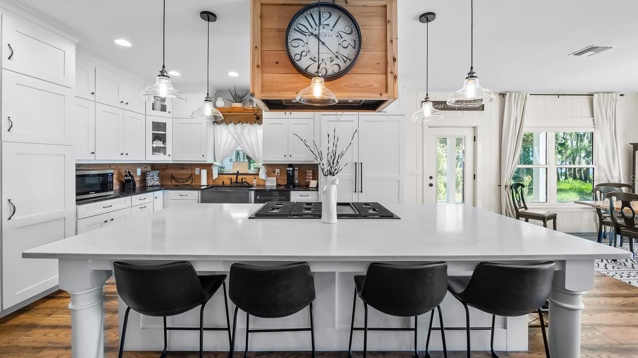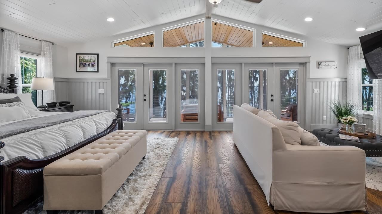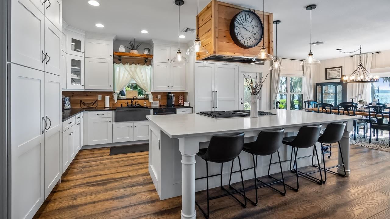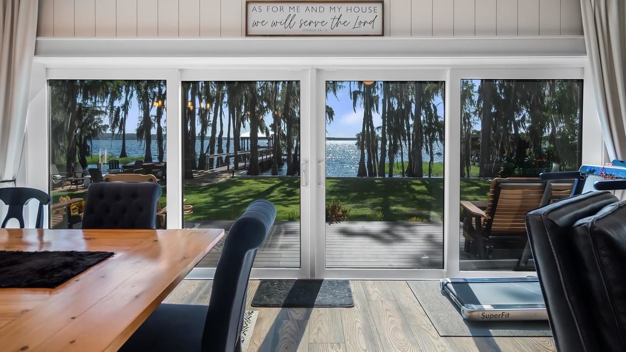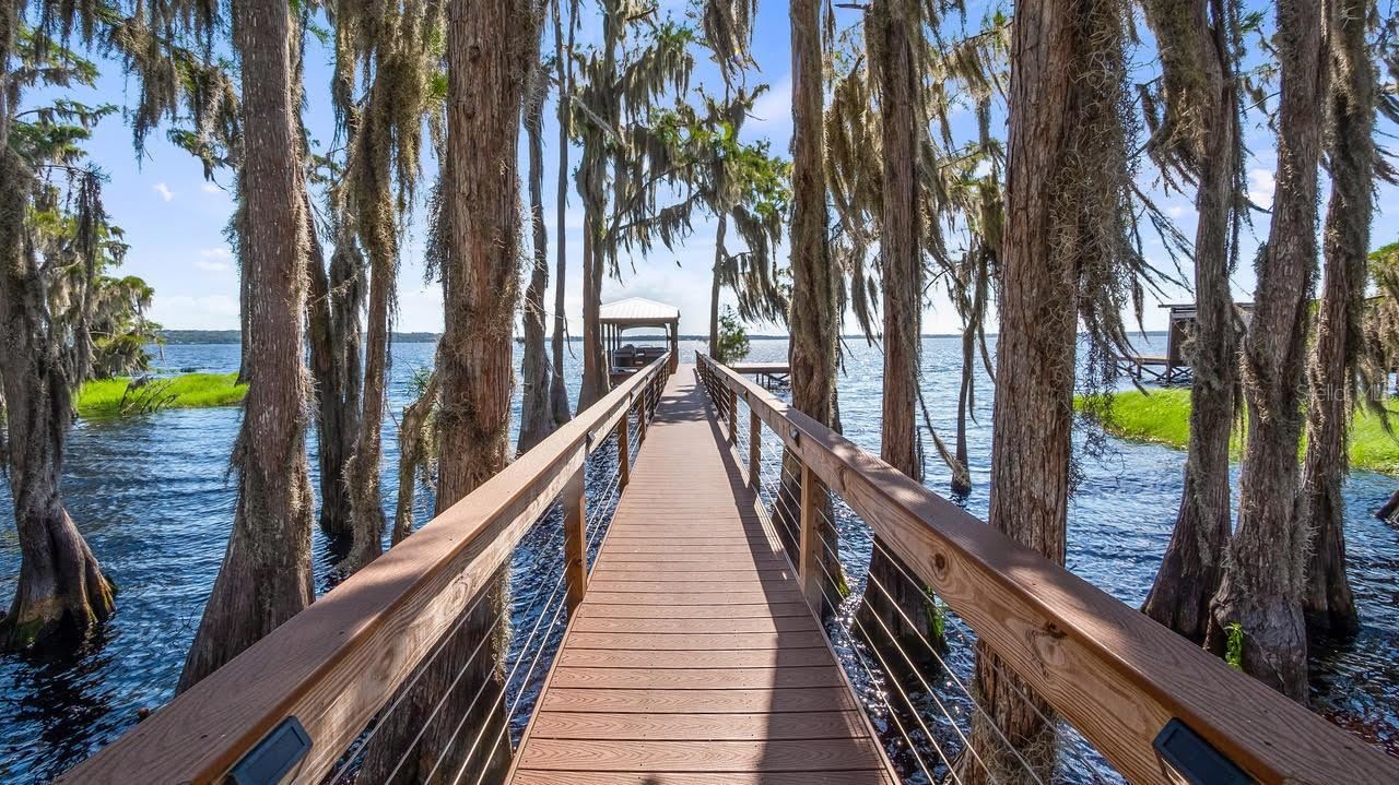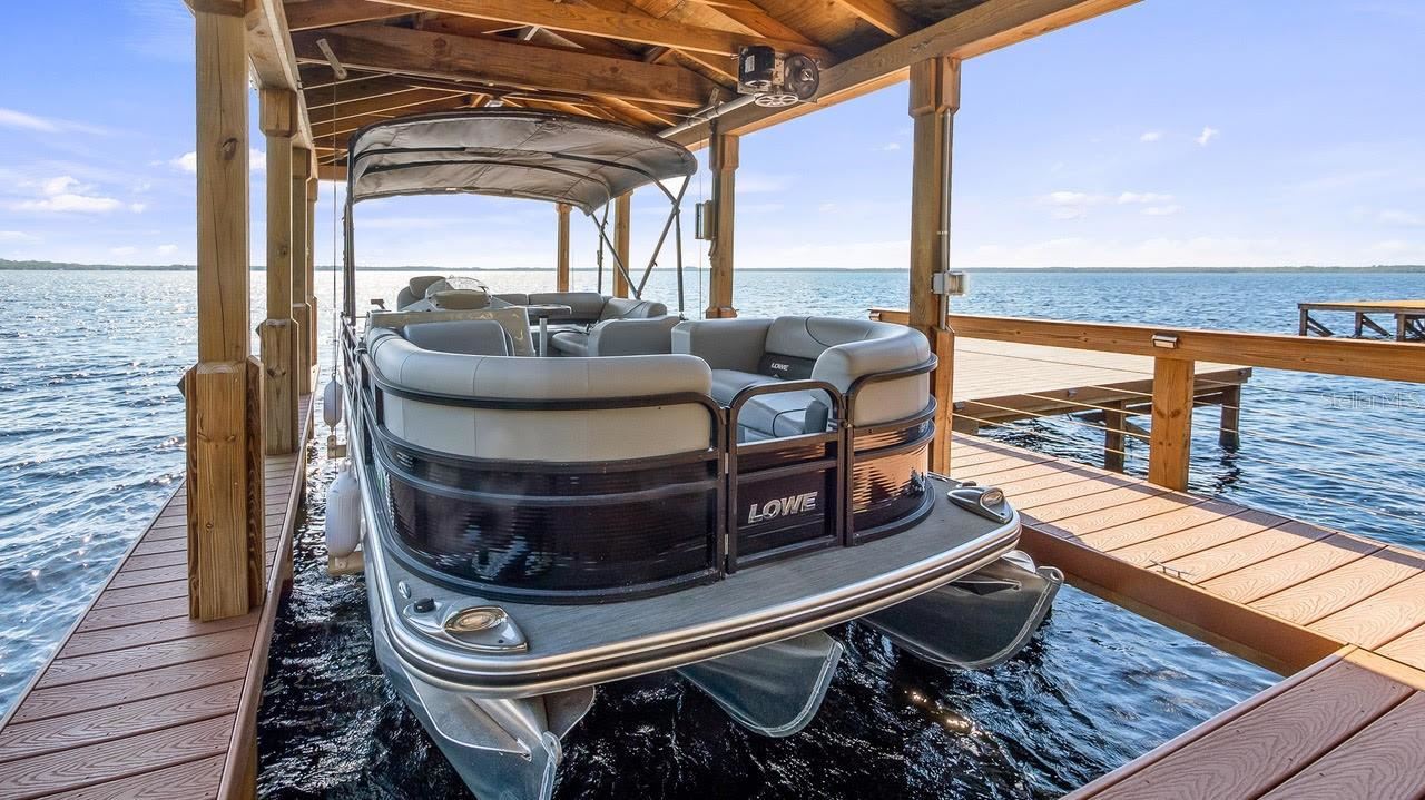 A RARE AND EXTRONDINARY OPPORTUITY AWAITS YOU WITH TIMELESS ELEGANCE AND COMFORTABLE LIVING WITH THIS 4 BEDROOM/4 BATHROOM DIRECT LAKE FRONT HOME ON THE CLERMONT CHAIN OF LAKES. With approximately 3220 sq ft of luxury living this 2019 home combines the finest of finishes with multiple upgrades. This home offers an open airy floor plan with lots of natural light and panoramic lake views of Lake Louisa for your enjoyment, and is perfect for entertaining family and friends. As you walk through the front door you will be greeted with a large great room adorned with high ceilings, a gas stone fireplace, luxury vinal plank flooring, Cypress accents, a gourmet kitchen, large windows, and pocket French Doors leading out to of the lake and boat house. The gourmet kitchen which flows seamlessly into expansive open living areas, is equipped with plenty of upgraded wood cabinets with pull out drawers, a large center island, luxury high end Dacor Appliances which are designed for style and efficiency. The Dacor built in column refrigerator also boasts a large freezer and icemakers. Baking and cooking gourmet meals are made easy with this Dacor 6 burner gas stove with an electric griddle, a dual oven that boasts a bread baking oven, and a food warmer. The formal dining room with views of the lake adds extra dining seating for those special occasions with family and friends. As you move through the home you will notice the tongue and grove and shiplap Cypress walls and accents, which makes this home especially stand out above the others. The downstairs bedroom with a large walk-in closet can be also used as a Primary Bedroom. The bathroom has a tiled walk-in shower, stone counter tops, luxury vinyl flooring. The downstairs office is large, and can accommodate 2 desks or a seating area. There is a door that leads outside the large laundry room with a connecting bathroom with Stone counter tops and walk in shower. The Crown Jewel is the owner’s Primary Retreat, boasting a seating area with a gas fireplace, dual closets, and French doors leading to your private relaxing screened balcony overlooking the lake with beautiful sunsets and sunrises, and cool breezes. Moving into the Primary Bathroom hosts a claw foot ceramic bath tub, his and her sinks, and large walk-in shower. To finish the upstairs, you will find 2 other bedrooms, 1 bathroom with tub & shower combo, and a flex room overlooking the lake that can be used as an office, nursery, man cave, den, the choice is yours. If you are looking for outdoor living this home has it. The outdoor features include, Composite wrap around porch with Cypress Ceiling, storage area with seating overlooking the lake with sink, fire pit, beach, sea wall, 2023 New boat house with electric and water, composite walkway deck, New Wrap Around Deck, New Water Purification System, New Sprinkler System, Gutters and Gutter Drains, New Curbing Around the Home, New Landscaping. 2025 New Septic Pump and Septic pump out. This residence offers elegant design, functionality, and stunning waterfront living, with skiing, boating and fishing on a 3600 Acre Lake which is the largest on the Chain. This home is the perfect format for modern day relaxing, enjoyment, and living.