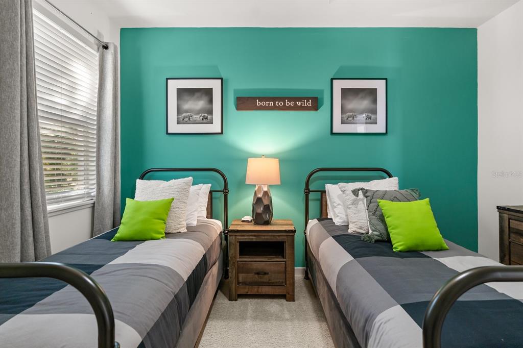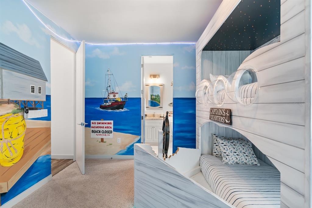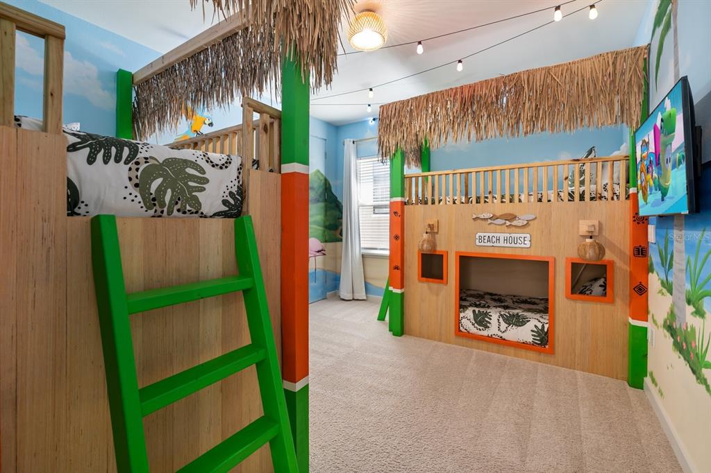 Themed bedrooms upstairs delight guests of all ages, offering immersive spaces that spark imagination and make every stay memorable. An upstairs laundry room adds convenience, while the bedroom layout provides privacy and comfort throughout. At the front of the home, an en-suite bedroom opens to a private balcony, while the rear of the home features an oversized primary suite with a large bathroom and its own balcony—both ideal for quiet moments of relaxation.