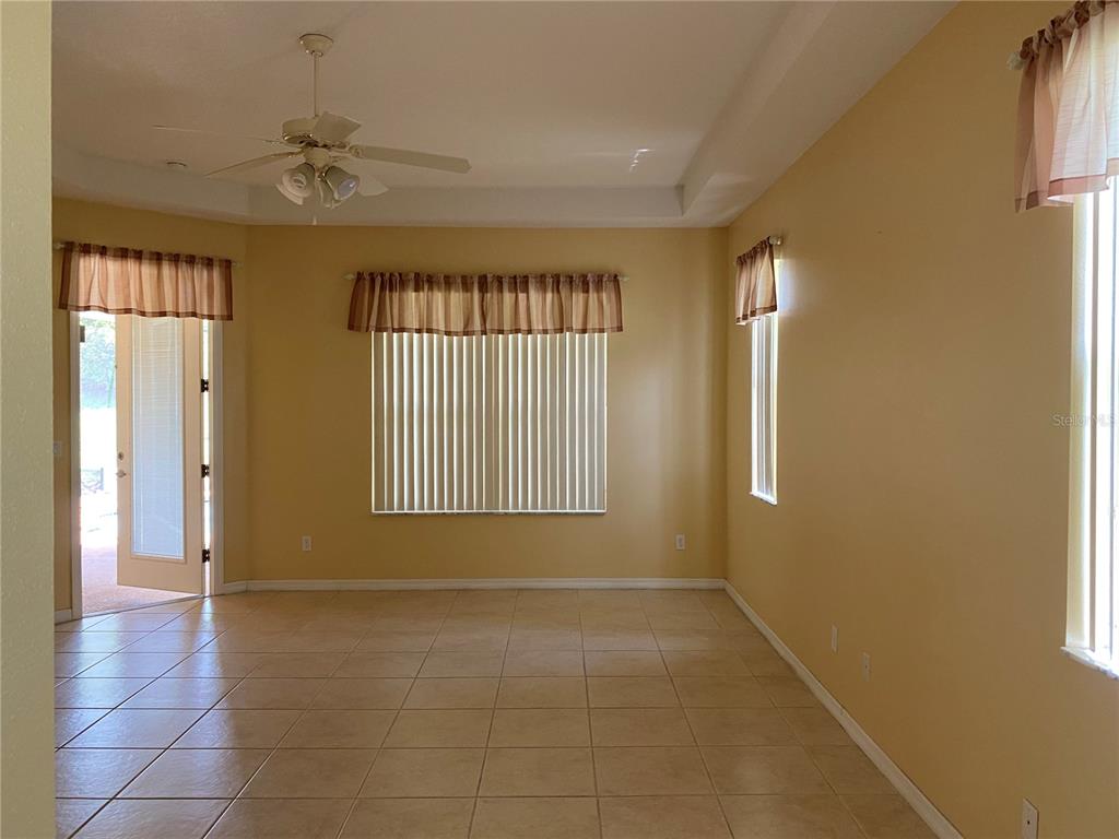 The kitchen is equipped with solid wood cabinetry, granite countertops, and stainless steel appliances, and opens to the family room with views of the screened-in, in-ground pool. Formal living and dining rooms provide additional space for entertaining. Ceramic tile flooring throughout the first floor.