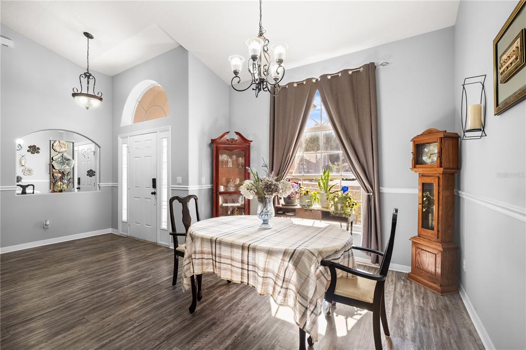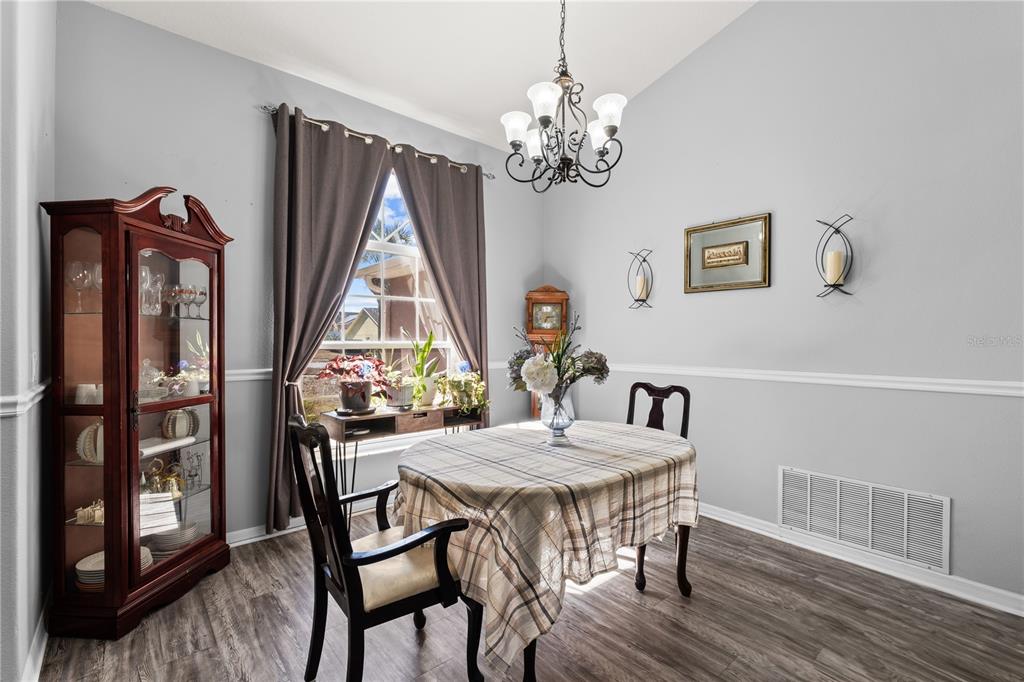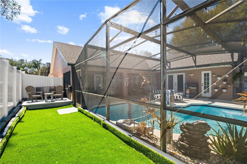 Step outside and you’ll see why this home really shines. The screened-in, gas-heated pool was resurfaced in 2022, with screens re-done the same year. The backyard also features a dedicated pool bath with direct access—no wet footprints through the house. There’s additional seating space under the covered porch, plus a custom turf dog run and a small deck/seating area, making this backyard a piece of paradise.