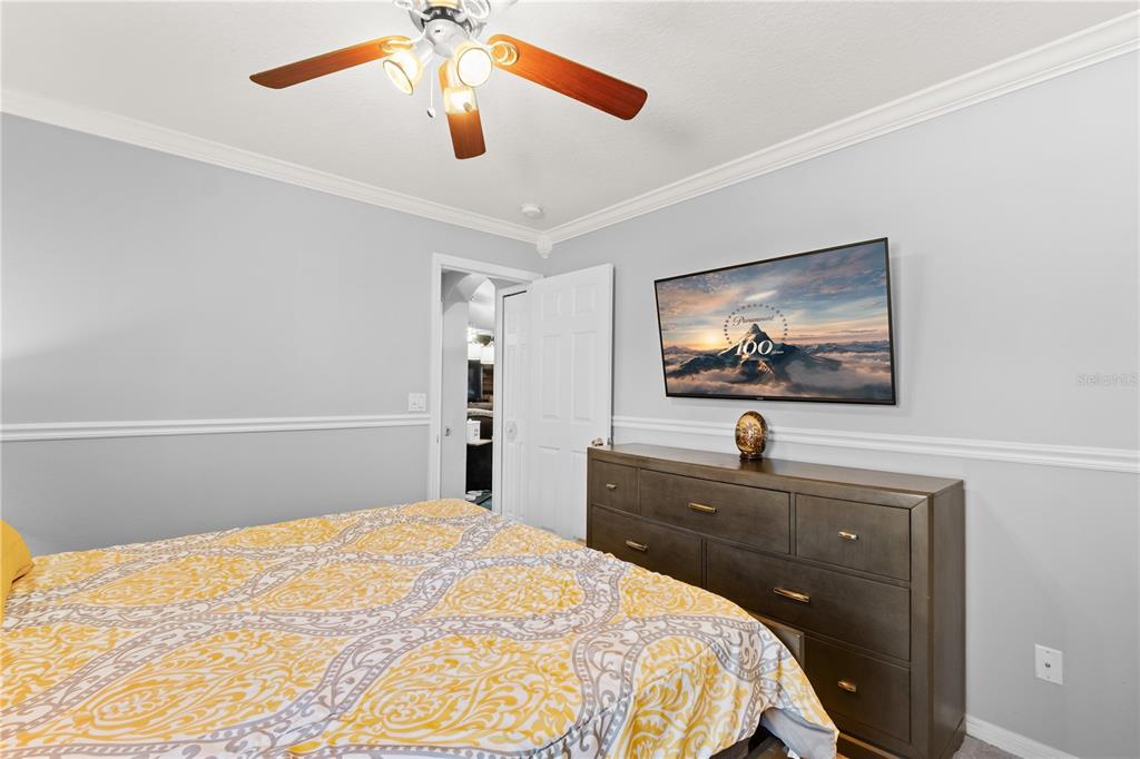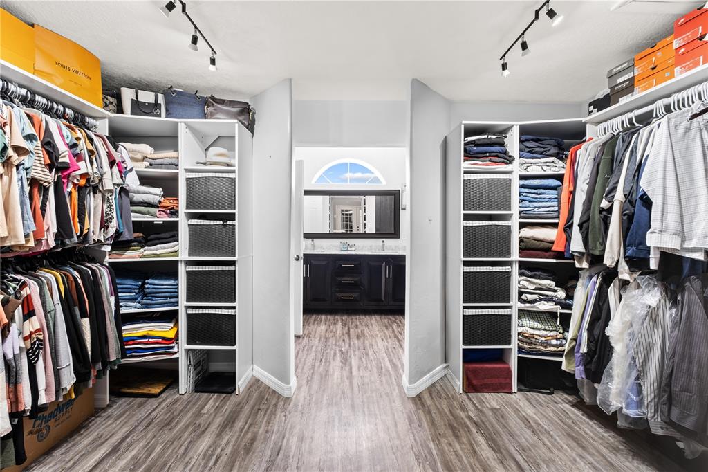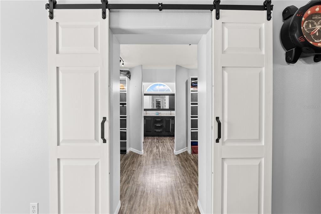The master bedroom offers tray ceilings, french doors for direct access to your pool, and a FULLY CUSTOMIZED WALK IN CLOSET.