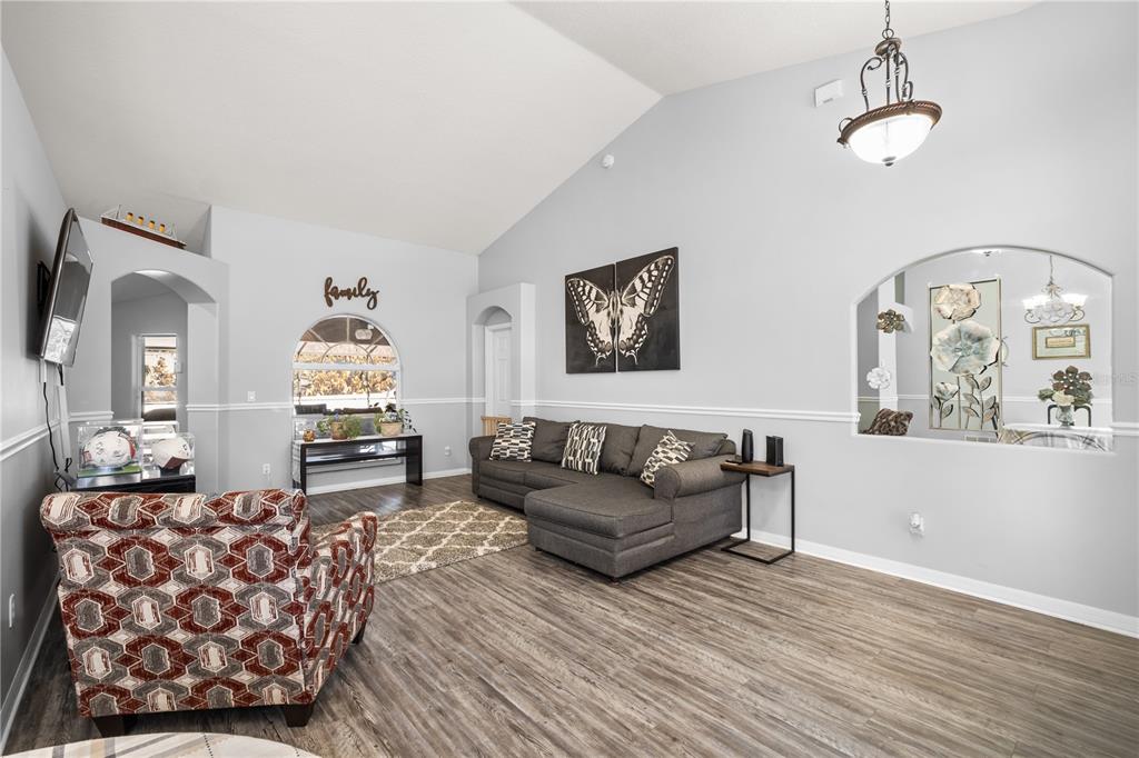 Built in 2001, this home offers the quality and character missing from today’s cookie-cutter new construction—rounded interior corners, solid construction, and a layout that simply makes sense. Inside, you’ll find Luxury Vinyl Plank flooring throughout the main living areas, carpeted bedrooms, and tile in all bathrooms. The living room is a showstopper with custom shiplap, while crown molding, updated bathroom vanities, and a renovated kitchen with granite countertops and modern backsplash elevate the entire space.