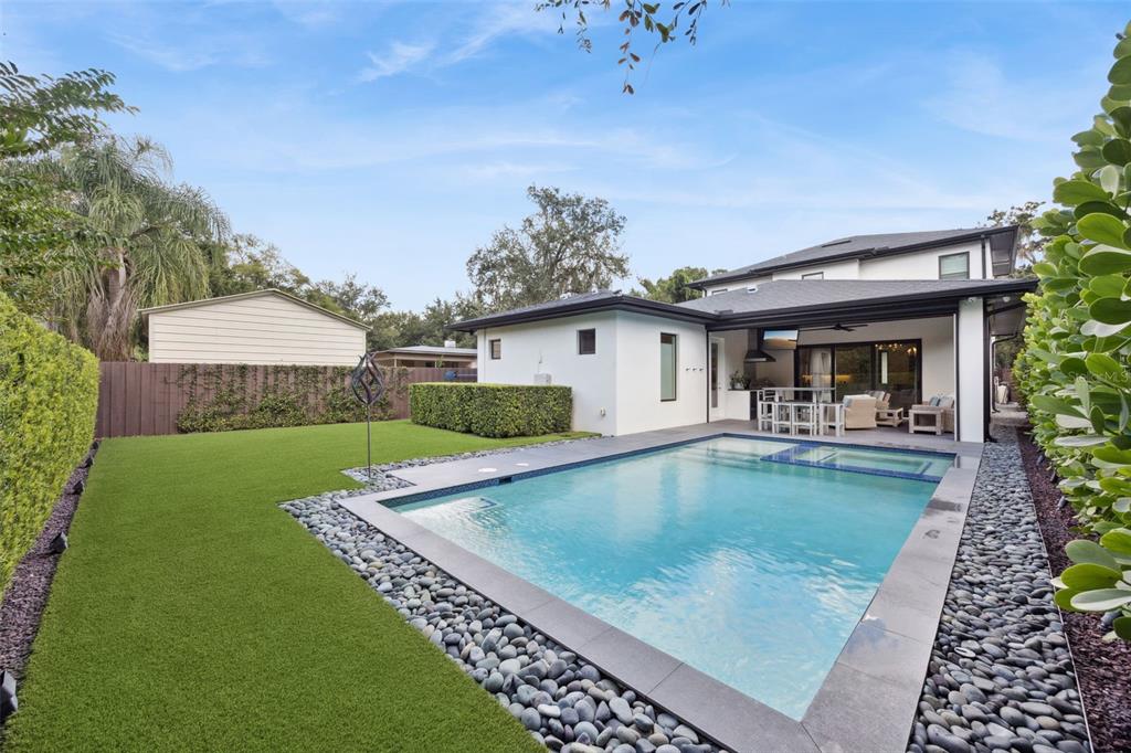 The private backyard is a true retreat, featuring a heated saltwater pool and hot tub, gas grill, motorized shades on the lanai and low-maintenance landscaping. The turf lawn is ideal for entertaining or quiet relaxation—all without the upkeep. The exterior of the property was freshly painted in 2026.