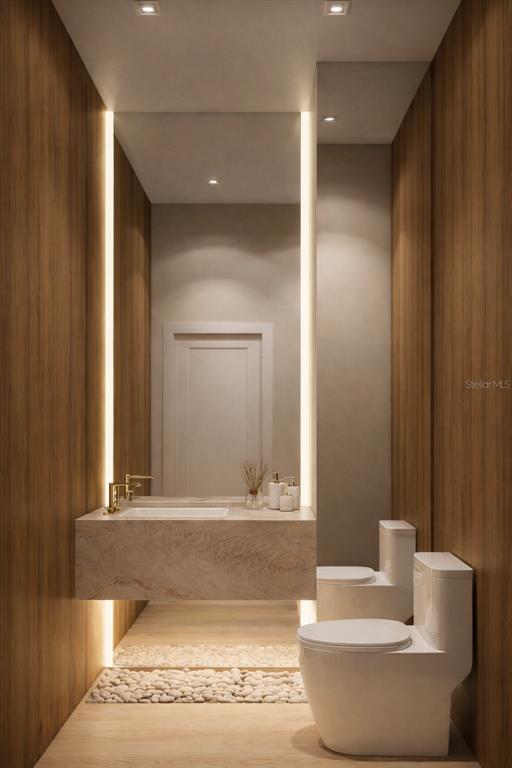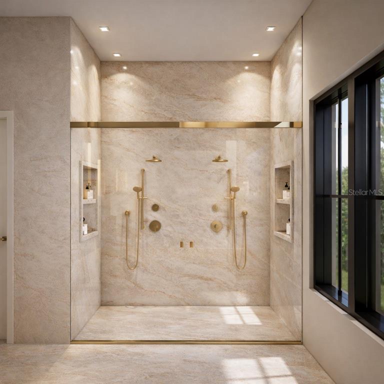 The first-floor primary suite is a private retreat defined by a serene palette, clean lines, and soft integrated lighting. The spa-inspired primary bath features Taj Mahal stone flooring, shower walls, and countertops, paired with a freestanding tub, a refined double vanity with vertical lighting, and warm gold accents that bring a sense of understated luxury. An expansive walk-in closet with custom cabinetry offers dedicated his-and-hers storage with a tailored, boutique feel.