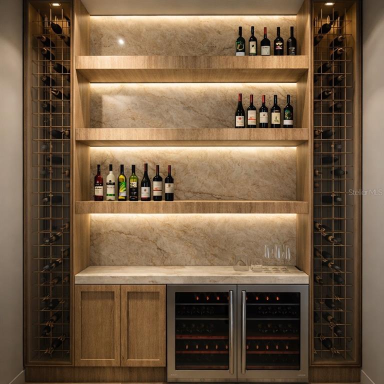 The main living spaces are designed with a seamless, open-concept layout, where the kitchen, dining, and living areas connect effortlessly and extend to the outdoors through expansive sliding glass doors. The living room features a statement Taj Mahal stone TV wall with a sleek fireplace, complemented by soft neutral tones, warm recessed lighting, and curated finishes that create a calm, elevated atmosphere. A refined built-in wine bar showcases warm wood cabinetry, soft integrated lighting, glass-enclosed storage, and dual wine fridges, adding both function and visual impact. Engineered hardwood flooring runs throughout, adding warmth and continuity to the home’s contemporary aesthetic.