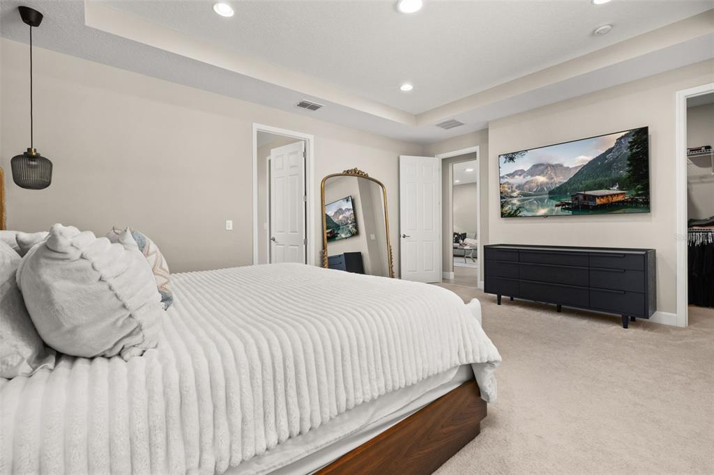 The PRIMARY BEDROOM IS CONVENIENTLY LOCATED ON THE MAIN FLOOR, offering privacy and comfort. It features a spa-like bathroom and two spacious walk-in closets. The bright and airy living area opens to a vast, beautifully landscaped backyard.