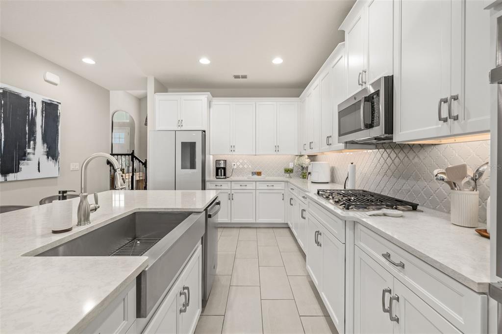 Featuring sleek tile flooring throughout the common areas, a GOURMET kitchen with quartz countertops, matching white cabinetry, a stylish white tile backsplash, STAINLESS STEEL APPLIANCES, and a WINE COOLER. The kitchen’s modern design seamlessly integrates a large island and dining area with comfortable seating for up to 10 people—perfect for entertaining. An exclusive and spacious pantry room offers exceptional storage, while the large laundry room includes a deep sink for added convenience.