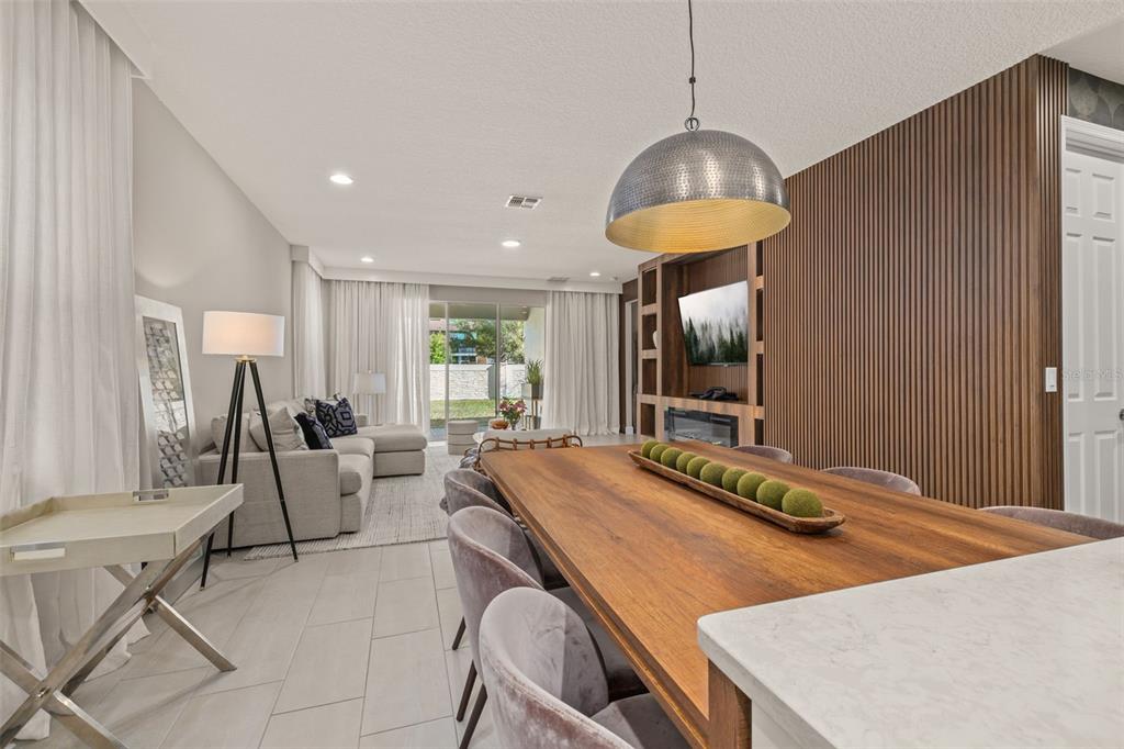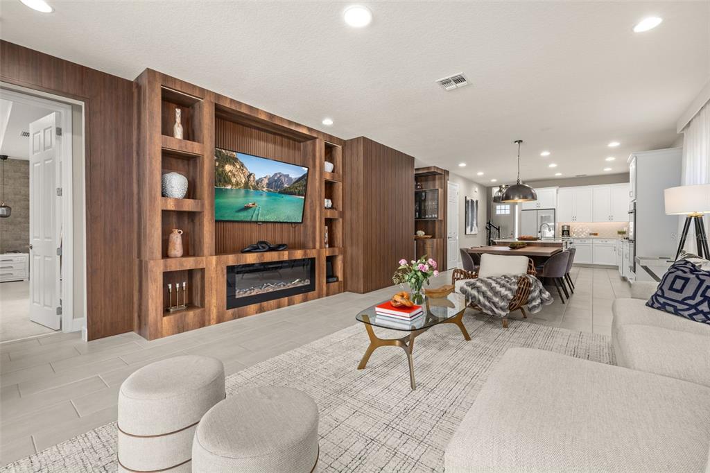 The home also showcases BEAUTIFUL CUSTOM CARPENTRY THROUGHOUT THE MAIN LIVING SPACE, highlighted by a STUNNING BUILT-IN ENTERTAINMENT WALL with rich wood paneling and display shelving. This CUSTOM MILLWORK WAS SPECIALLY DESIGNED BY THE SELLERS AND REPRESENTS A SIGNIFICANT INVESTMENT, making it a truly unique focal point and the home’s signature upgrade.