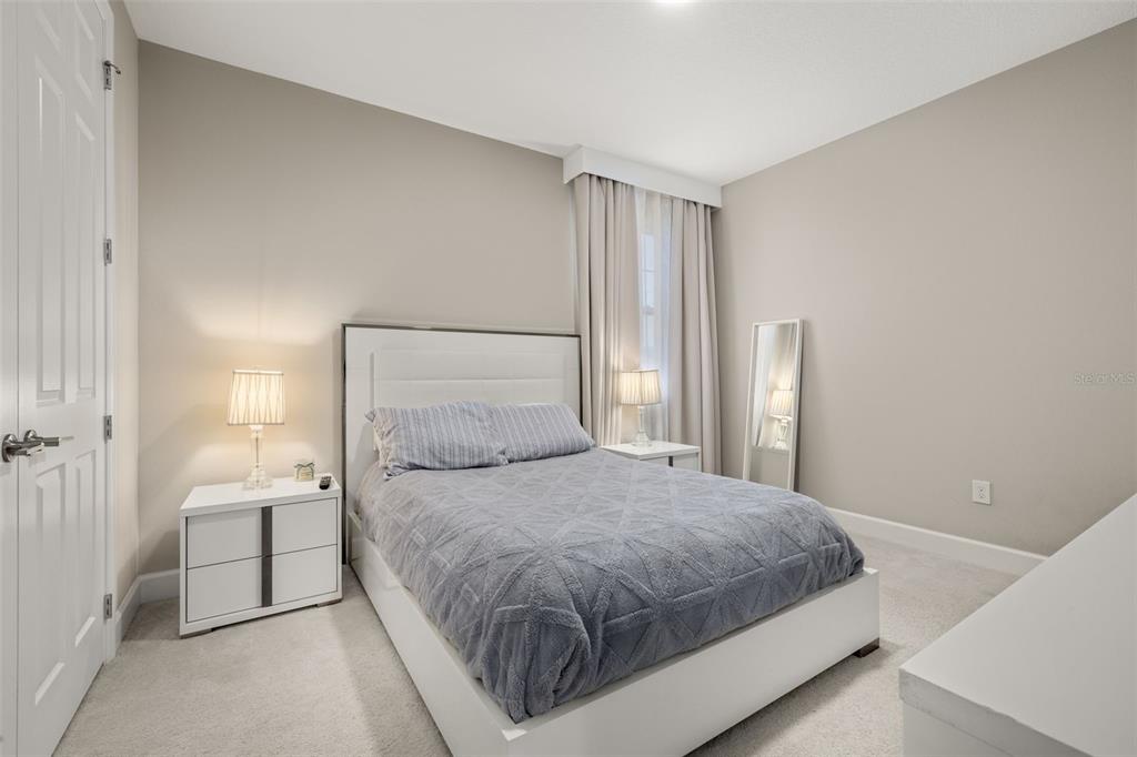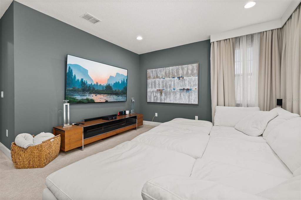 A staircase with ELEGANT WOOD FLOORING leads to the upper level. Plush carpet enhances comfort throughout the bedrooms, with two bedrooms sharing a bathroom equipped with dual sinks and a bathtub. A second master suite includes a private bathroom with white cabinetry, a glass-enclosed shower, and elegant finishes. The EXPANSIVE loft area is perfect for a TV room, home office, or entertainment space.