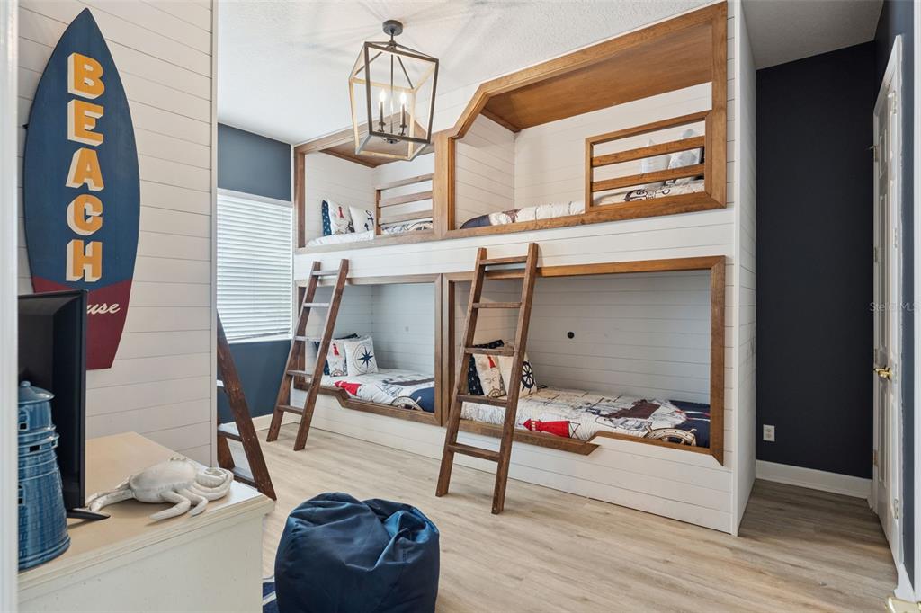 Upstairs, you’ll find newly updated flooring throughout the second level, along with two guest bedrooms, including one featuring professionally designed beach-themed bunk beds that guests will love. The spacious primary suite is also located on the second floor and includes a private ensuite bathroom with a relaxing soaking tub and a separate large shower.