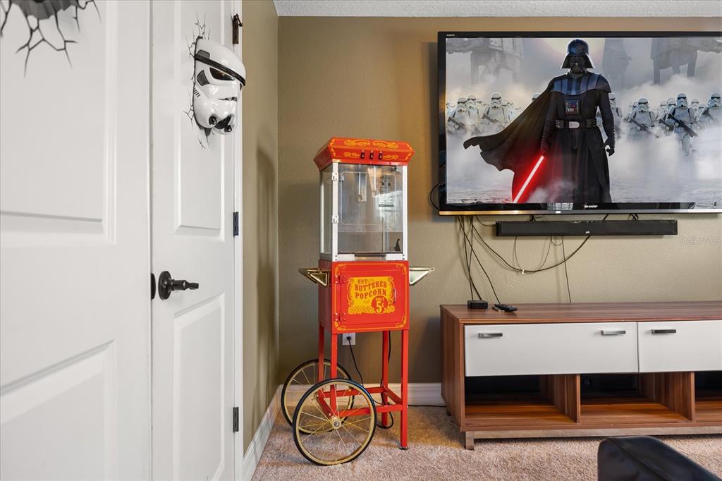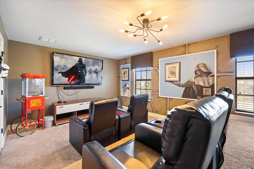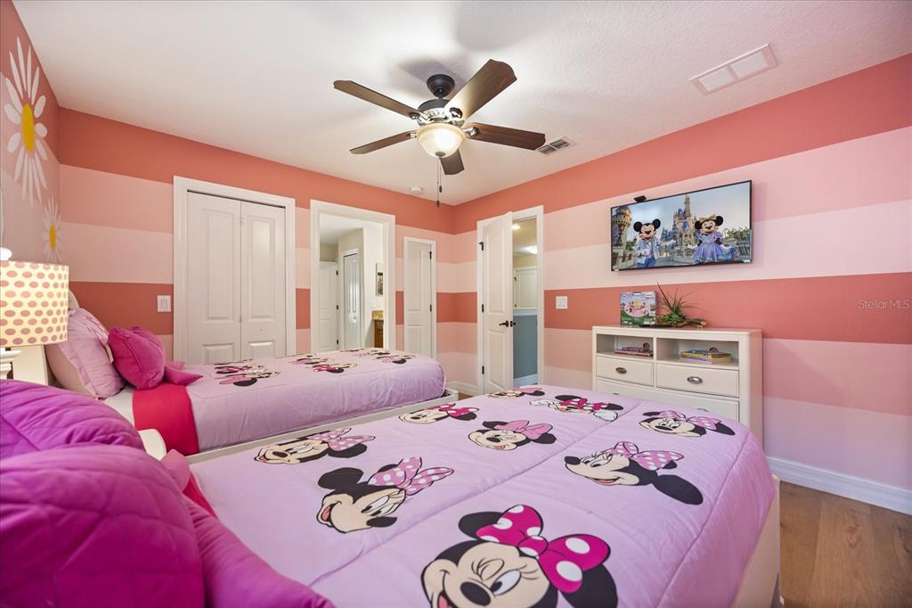 TURNKEY VACATION HOME! Located in the attractive Champions Gate Resort and Golf Community, this gorgeous 3900 square foot, 8-bedroom, 5-bathroom house is beautifully decorated and furnished throughout. With a large open floor plan where the kitchen flows into the spacious living-room and dining room, you can entertain all your family and friends. Unlike the majority of the homes in Champions Gate this home has NO REAR NEIGHBORS which is perfect for privacy! The pool also backs up to the SOUTH WEST which allows for NIGHTLY SUNSETS as well as sun exposure over the pool area into the late afternoon! This helps tremendously from a rental standpoint as it makes for an excellent pool photo and is the perfect way to wrap up long family days at the parks and watch the sun disappear before dinner! This home is not in a rental program and has been meticulously maintained by the current owner! This home has something for everyone including multiple themed bedrooms including a secret BLUEY room for the little ones under the staircase! Other themed rooms such as HARRY POTTER, STAR WARS MOVIE THEATER, PRINCESS ROOM, & MICKEY! All professionally decorated to enhance the experience of a true Florida vacation. The garage game room also has an AC UNIT which allows it to be used even during the hotter months of the year. Take advantage of one of the best features of the community and spend the day at the Oasis Club House which includes a kid’s pool, splash pad, family pool, lazy river with a water slide, private cabanas, tiki bar, fitness center, arcade, theatre, restaurant, and bar. Located centrally within all the vacationers “go to” spots so you will always have something fun to do. Included in your HOA is a 24-hour guarded gate, cable, internet, clubhouse, all exterior landscaping, tennis courts, and volleyball courts! Don’t hesitate to put in your offer for this wonderful investment today!