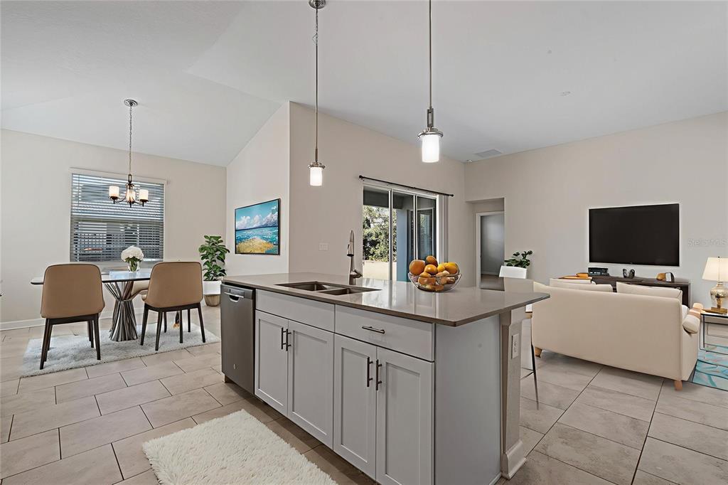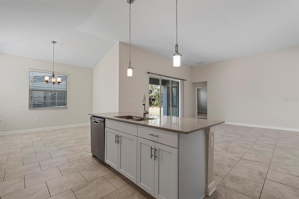 Inside, the open floor plan connects the main living areas seamlessly, creating a bright and inviting space. The kitchen is centrally positioned and features stainless steel appliances, quartz countertops, generous cabinet storage, and a large island that works perfectly for meal prep, casual dining, or entertaining. Neutral finishes and thoughtful details throughout the home create a clean, move-in-ready feel.