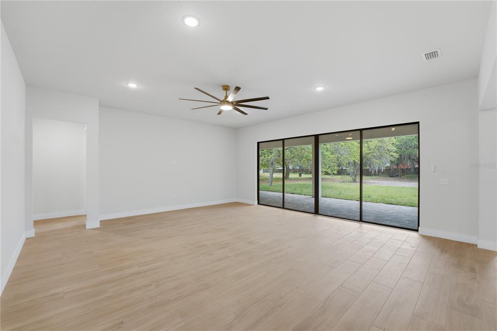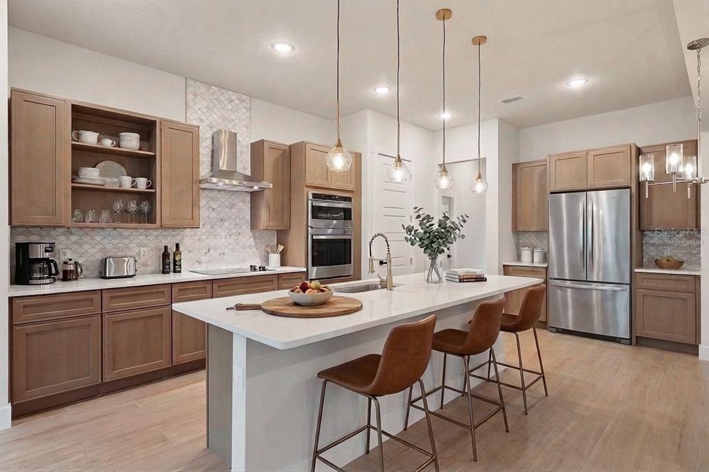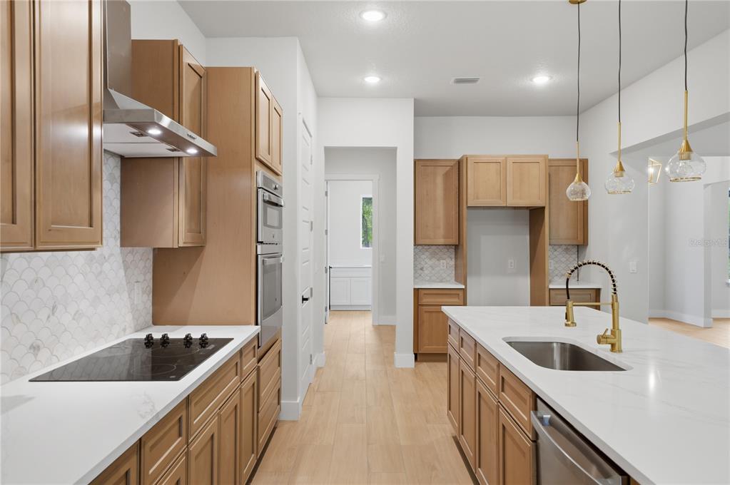 One or more photo(s) has been virtually staged. Welcome to your private slice of Florida living—where space, style, and convenience come together on a generous .86-acre homesite. Striking contemporary elevation with clean architectural lines and elegant stone accents, creating a timeless yet modern curb appeal. Large windows enhance the exterior design while bringing in natural light, and an inviting entryway. Open-concept layout highlighted by a gourmet kitchen with quartz countertops, built-in oven, glass cooktop, plenty of room for your coffee station, and a spacious closet pantry. The living area opens through large sliding glass doors to a covered rear porch, perfect for indoor-outdoor living. Enjoy added convenience with a mudroom entry from the garage, an inside laundry room, and tile flooring throughout the entire house. Situated near Lakefront Park, Neo City, with easy access to the Florida Turnpike.