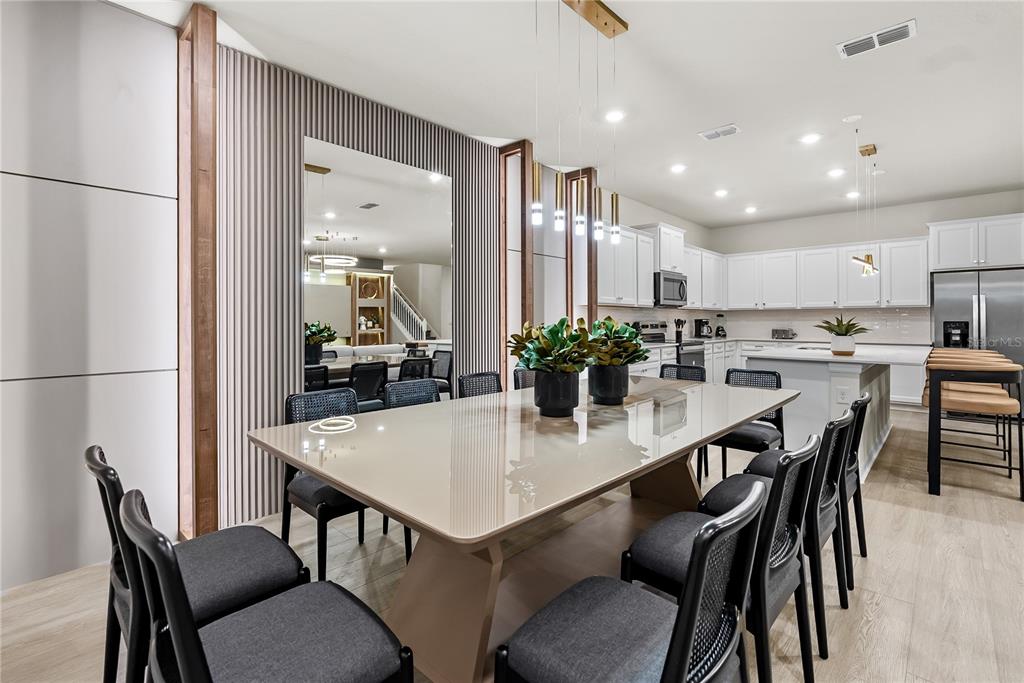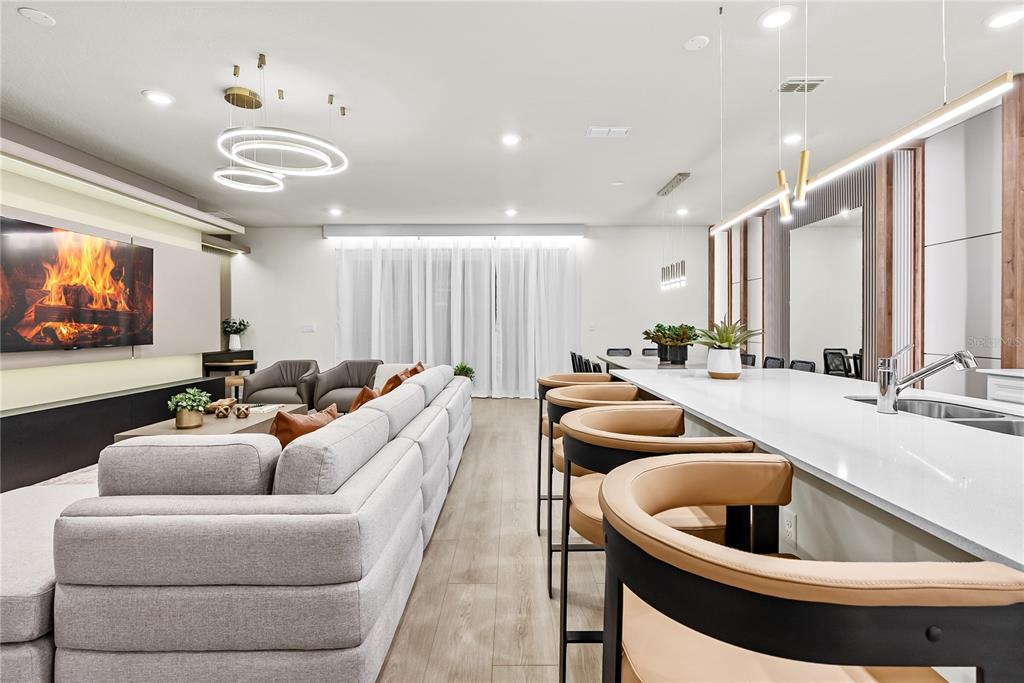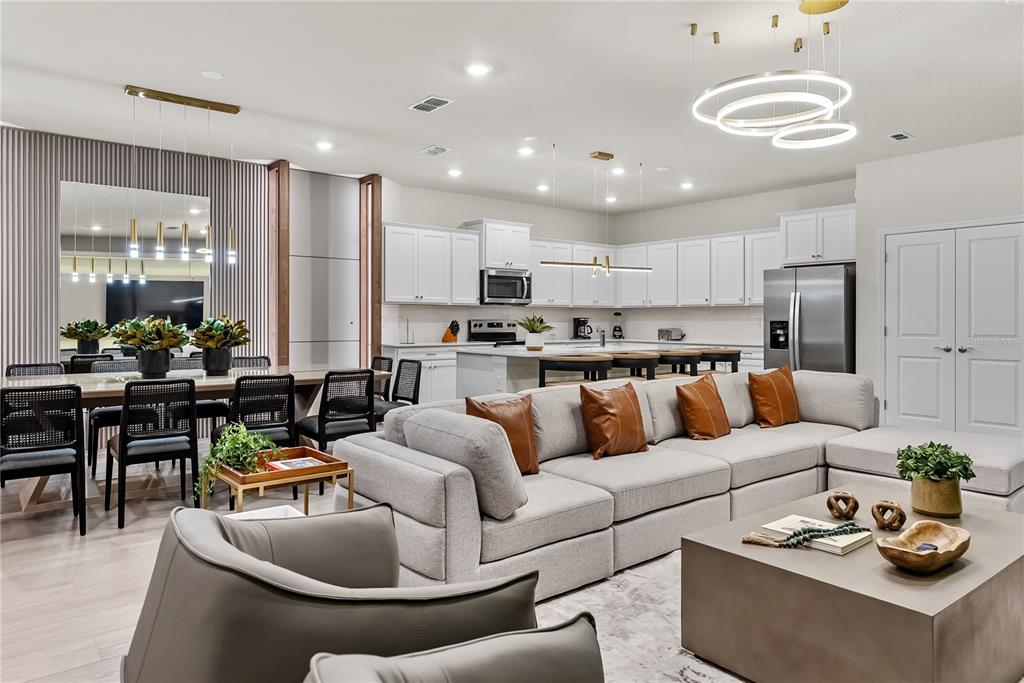 The bright open-concept floor plan features expansive living and dining areas ideal for large gatherings. The modern chef-inspired kitchen is equipped with sleek finishes, stainless steel appliances, generous cabinetry, and an oversized island designed to comfortably accommodate guests.