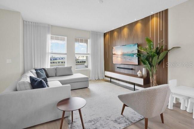 The home includes a dedicated office space, thoughtfully designed and decorated, perfect for working from home. Enjoy the stylish TV/family room with a stunning wood slat accent wall and LED lights, adding warmth and sophistication to the space.