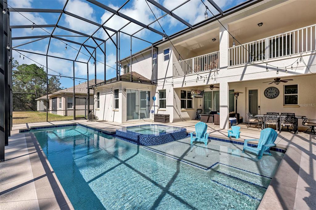 Step outside and prepare to be wowed. Your screened-in outdoor oasis features a sparkling in-ground pool and spa, creating the ultimate space for year-round enjoyment. With no rear neighbors, you’ll enjoy added privacy and peaceful views. The upstairs balcony opens directly into the screened lanai, offering a unique and elevated place to unwind with your morning coffee or evening drink.