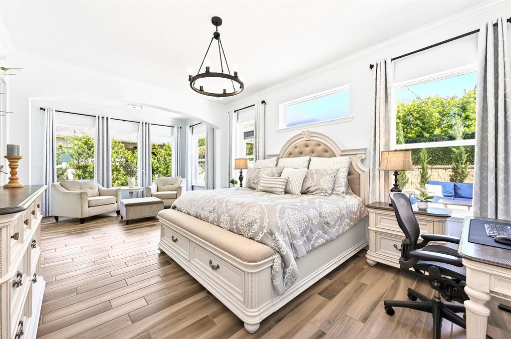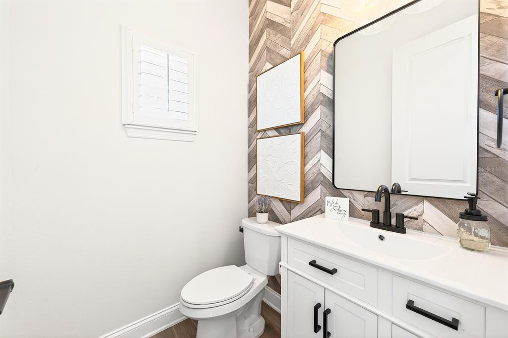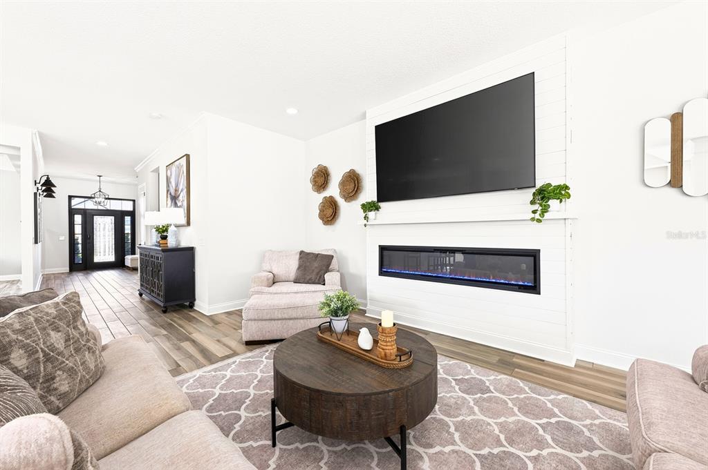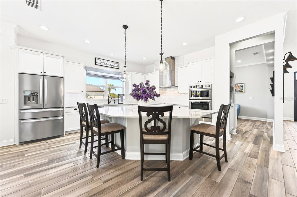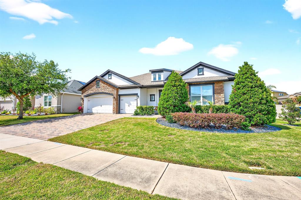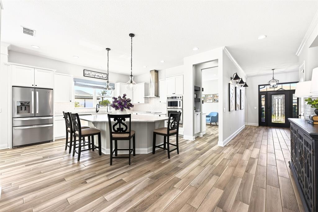 OWNED SOLAR, a CUSTOM BACKYARD OASIS, and a long list of thoughtful UPGRADES come together in this beautifully enhanced home in the highly sought-after Johns Lake Landing community of Clermont! From the moment you arrive, the BRICK PAVER DRIVEWAY and BRICK FACADE set the tone and it is clear this property was designed for elevated living with comfort, style, and functionality in mind. Step inside to find WOOD LOOK TILE flooring throughout, high ceilings, crown molding, 8-FOOT DOORS, and a light, bright OPEN CONCEPT layout that still offers defined living and dining spaces. The living room is anchored by an ELECTRIC FIREPLACE and TRIPLE SLIDING GLASS DOORS that open seamlessly to the COVERED LANAI, creating the ultimate INDOOR/OUTDOOR LIFESTYLE Florida is known for. The kitchen is a true showpiece, featuring a fresh modern color palette, upgraded appliances, sleek hardware and fixtures, a subway tile backsplash, a large ISLAND with bar seating, and a window that fills the space with natural light. Just beyond, a massive 17×12 CUSTOM BUTLER’S PANTRY/MORNING ROOM delivers incredible storage and functionality and is perfect for keeping everything organized and within reach.