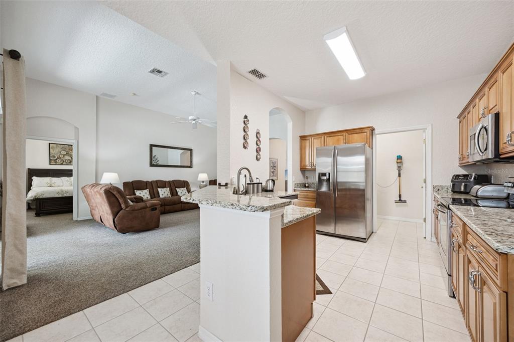 The lovely open plan living area overlooks the sunny pool deck with the sparkling blue pool and wonderful conservation views. The kitchen has been remodeled and is very stylish… with upgraded cabinets, granite countertops and stainless steel appliances.