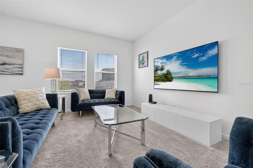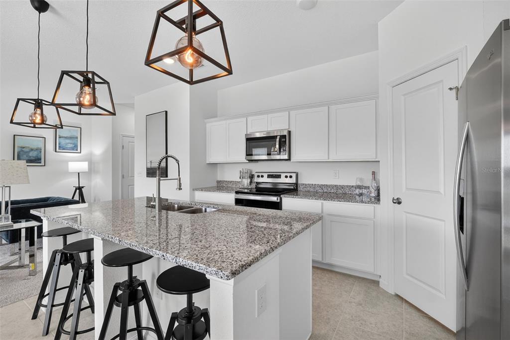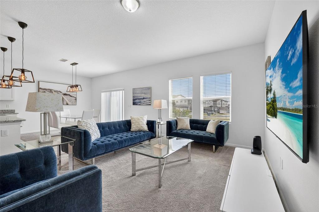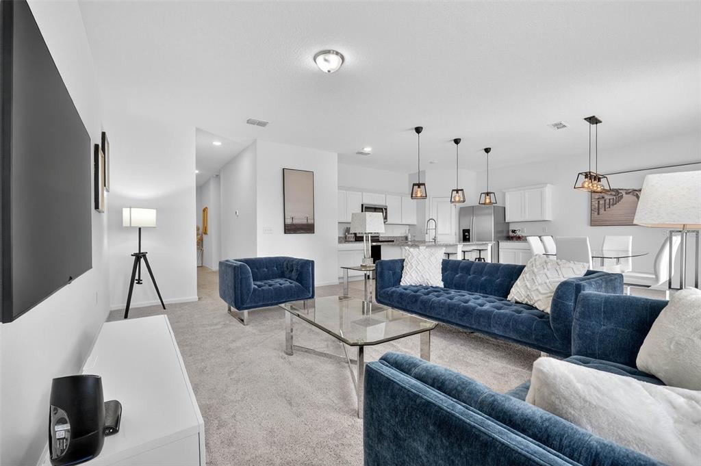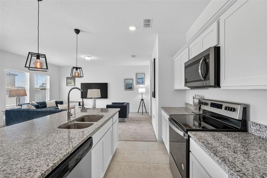 The open-concept main floor features a spacious family room filled with natural light, creating an inviting space for both relaxing and entertaining. The kitchen stands out with elegant cabinetry and quartz countertops.