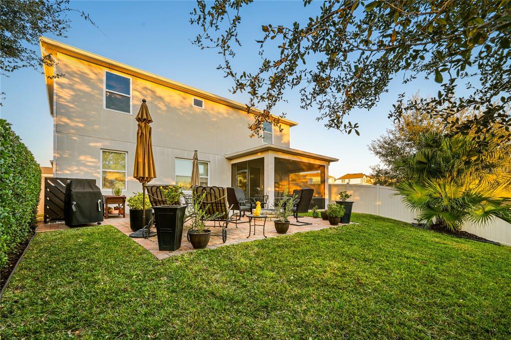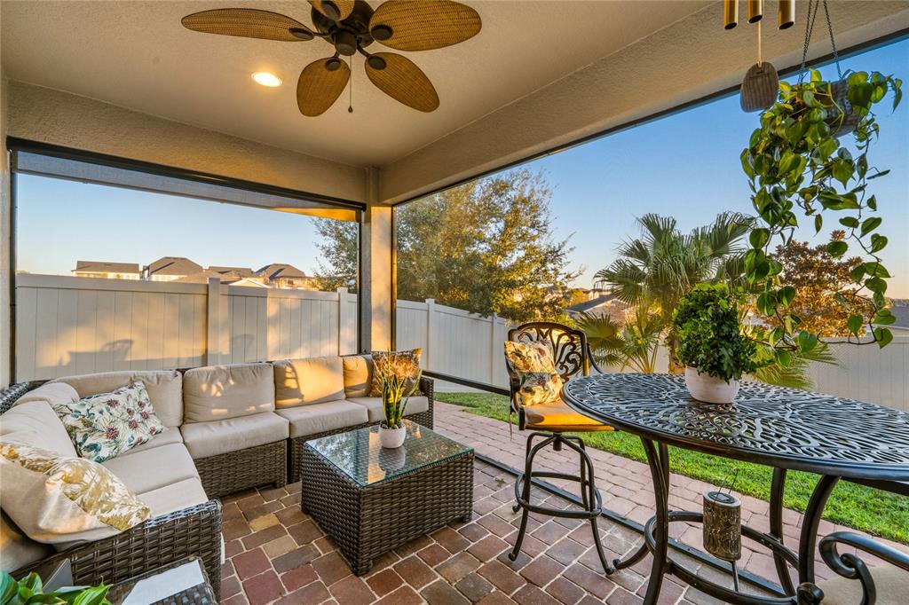 Upstairs offers three bedrooms plus a massive bonus room that can function as a media room, office, or optional fourth bedroom. The primary suite features tray ceilings, Brazilian cherry flooring, a Closets by Design walk-in closet, and a beautifully updated shower. Oversized garage, screened patio, extended pavers, fenced yard, and a fire pit complete the lifestyle.