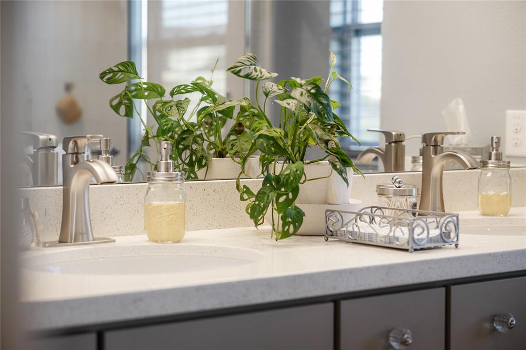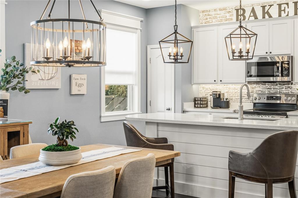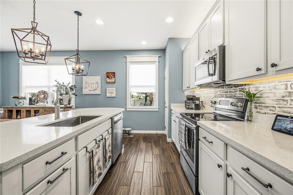 Inside, the open layout feels clean and cohesive with wood-look tile plank flooring, quartz countertops, stainless appliances, and updated lighting. Plantation shutters and designer roller shades throughout, plus an automatic shade at the sliding glass door, add comfort and a modern finish.