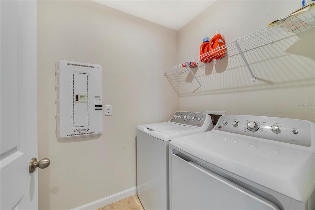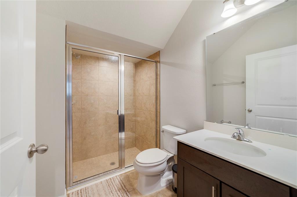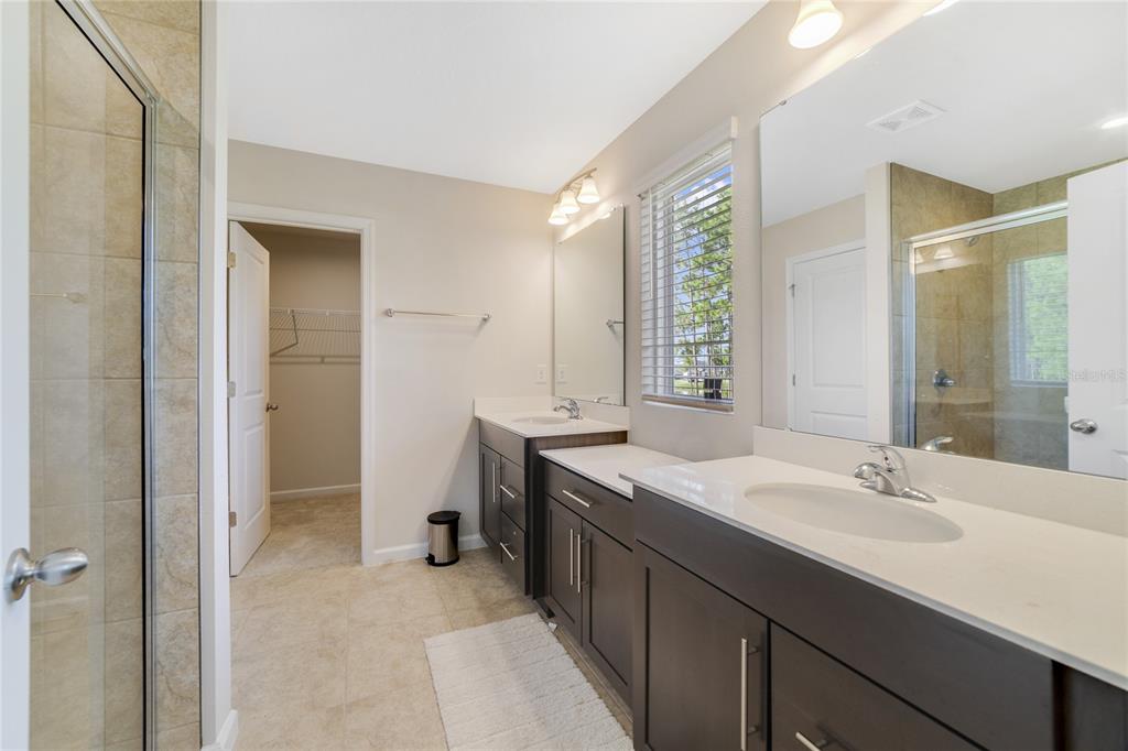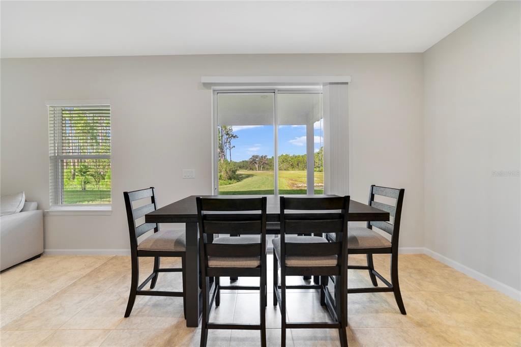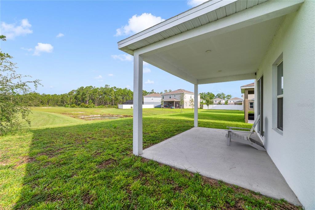 The home’s five bedrooms are generously sized, including a well-appointed primary suite that offers ample closet space and a private ensuite bath. A dedicated laundry room with washer and dryer adds convenience to the home’s layout. Sliding glass doors lead to a covered lanai overlooking a private backyard with serene green space views, offering a peaceful retreat and the ideal spot for outdoor dining or relaxation.