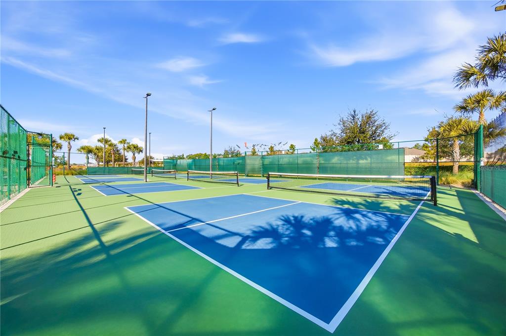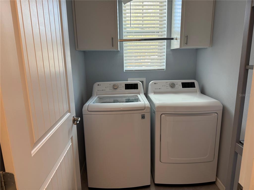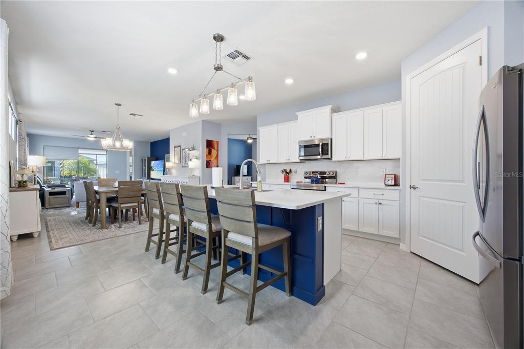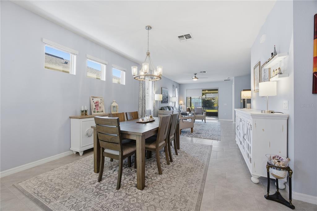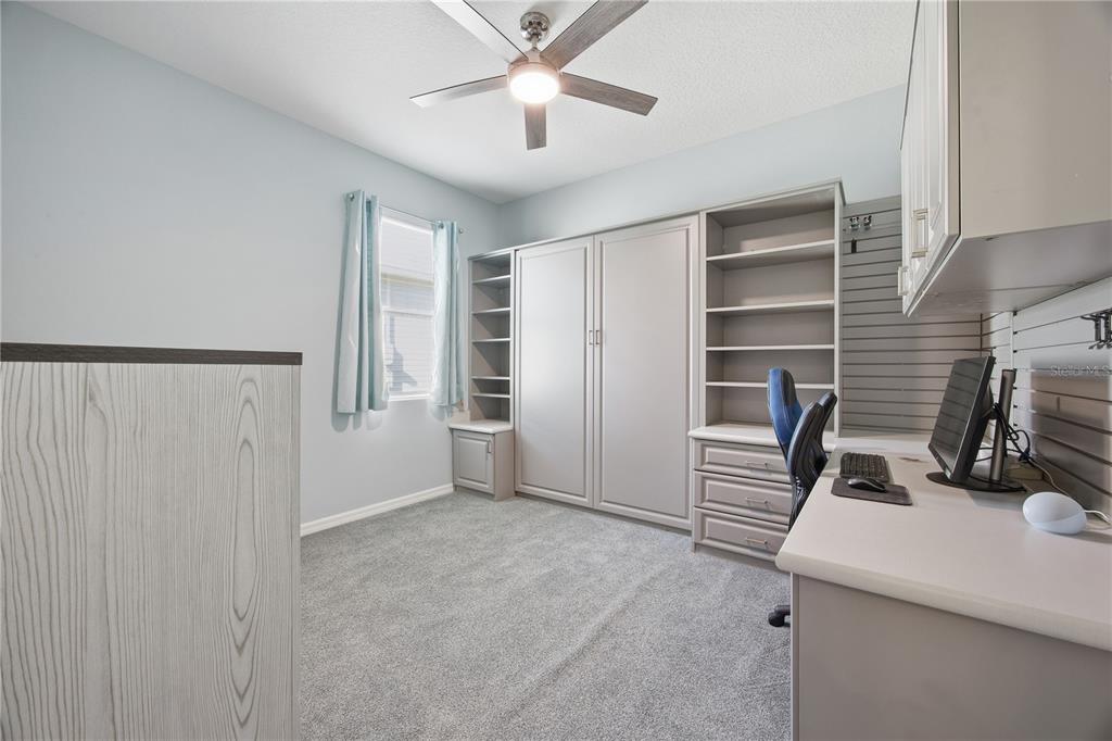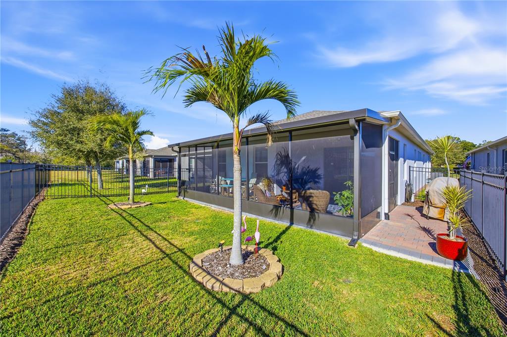Welcome to this beautifully upgraded home with 2 bedroom/2 bath and a den in the 55+ gated community of Palms at Serenoa. A golf cart friendly community with active resort style living. Wow! This home shows like a model starting with the great curb appeal of mature landscaping and extended pavers on both sides of the driveway for ease of parking. A new roof (2023) and gutters (2020) have been added and the outside of house was painted in 2025. Newer Garage Door and Opener added. Garage has added cabinetry, workbench and overhead shelving. The Desmond plan has an open floorplan allowing you to see from the front of home out to the back lanai and yard. Plenty of light flows through this space. House has an Alarm – Smart Panel System adding convenience and peace of mind. The kitchen has been upgraded with quartz countertops and backsplash, newer sink and faucet, and newer light fixtures over the island. Newer Range and Refrigerator. An electrical outlet has been added in the custom pantry. The large island provides room for barstools to enjoy entertaining and conversing with guests. Washer and Dryer are included. The spacious Primary suite has a walk-in custom closet system, double vanity and walk in shower. The 2nd bedroom and Den have custom closets. The 2nd bedroom includes a Murphy bed and a desk area. Perfect for a home office, a guest bedroom or craft room. Comfort height toilets added in both bathrooms. The Living Room has space for a large entertainment center and is open to the Dining Room and Kitchen. The sliding glass doors have custom blinds operated with a remote control for ease of opening and privacy. Enjoy entertaining on the extended paver covered lanai under roof. Great for morning coffee or relaxing in the evening while enjoying the tranquil back yard. A separate paver patio was added. Great for grilling. Fenced on all 3 sides. Everything has been well thought of. The community amenities include a pool, Yoga Studio, fitness center, Media room, Bocce Ball Courts, Pickleball courts, fire pit, enclosed screen porch with tables by pool, dog park, walking trails and social activities. So much to chose from. Close to shopping, restaurants and major attractions. A perfect place to call home. Welcome Home!