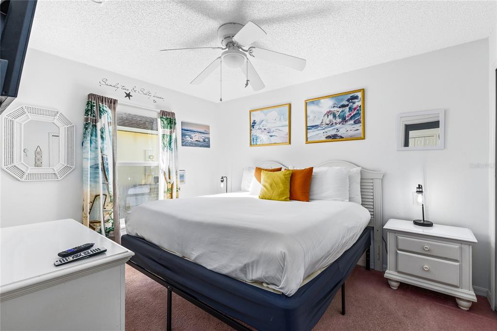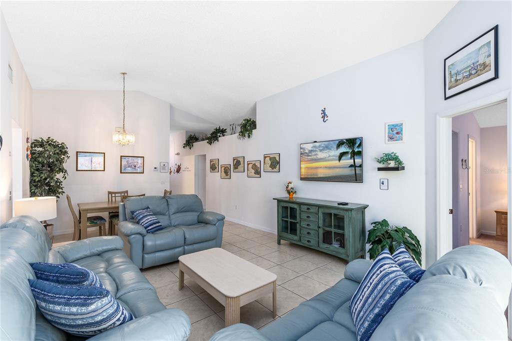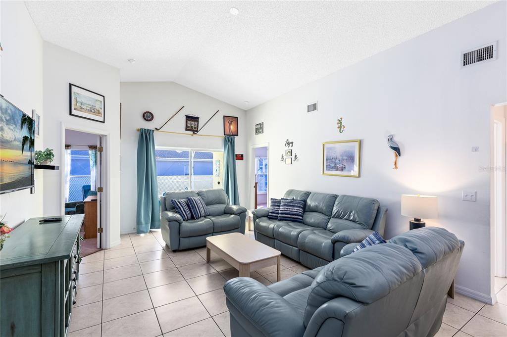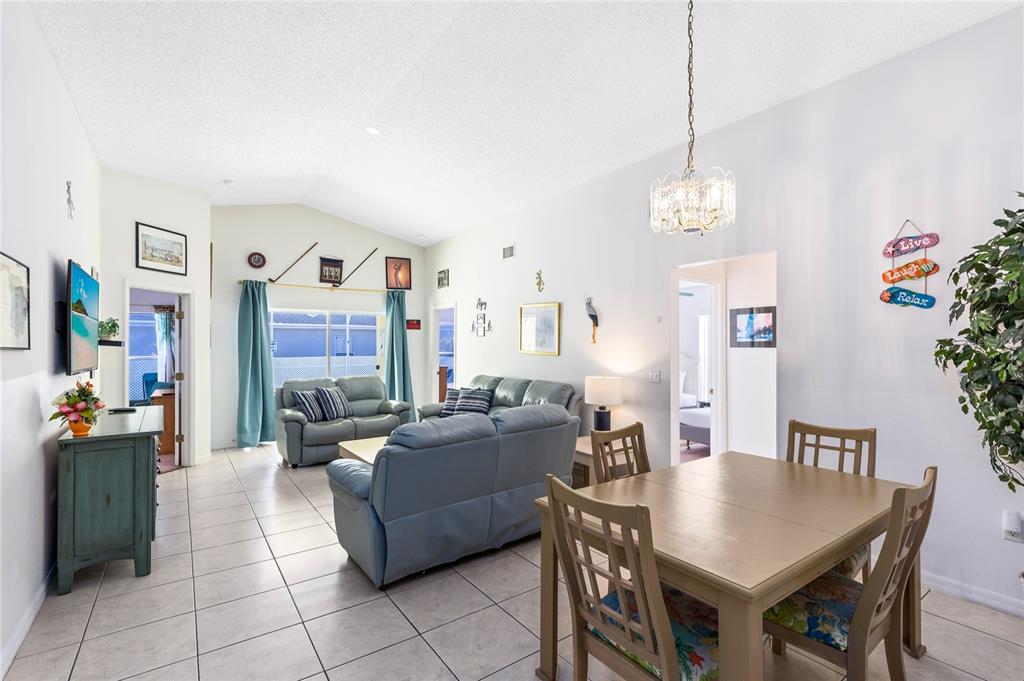 The open living and dining areas feature tile flooring and large sliding glass doors that lead directly to the screened lanai, creating seamless indoor outdoor flow. Natural light fills the main living space, and the vaulted ceilings make the home feel larger than its footprint.