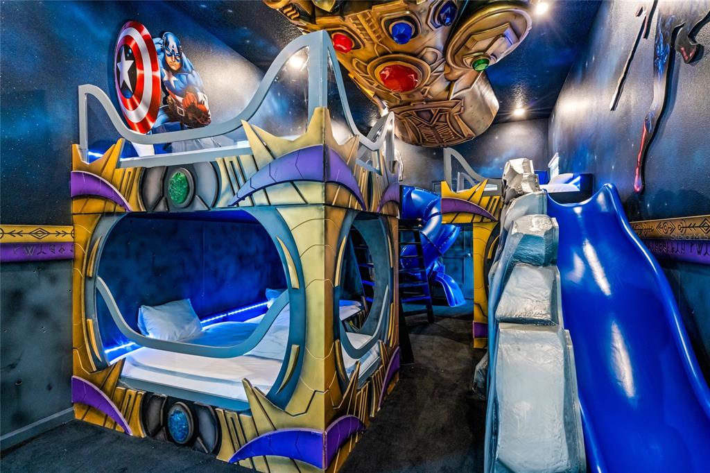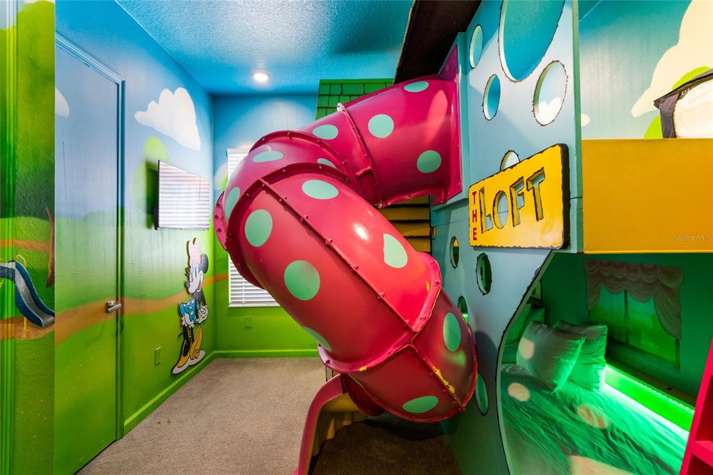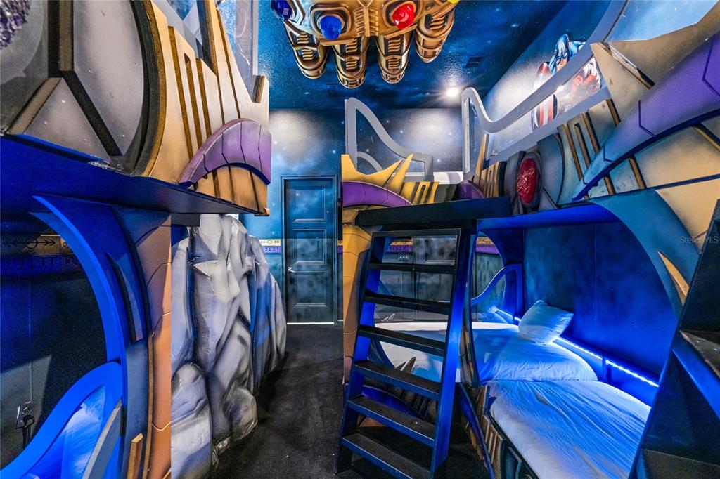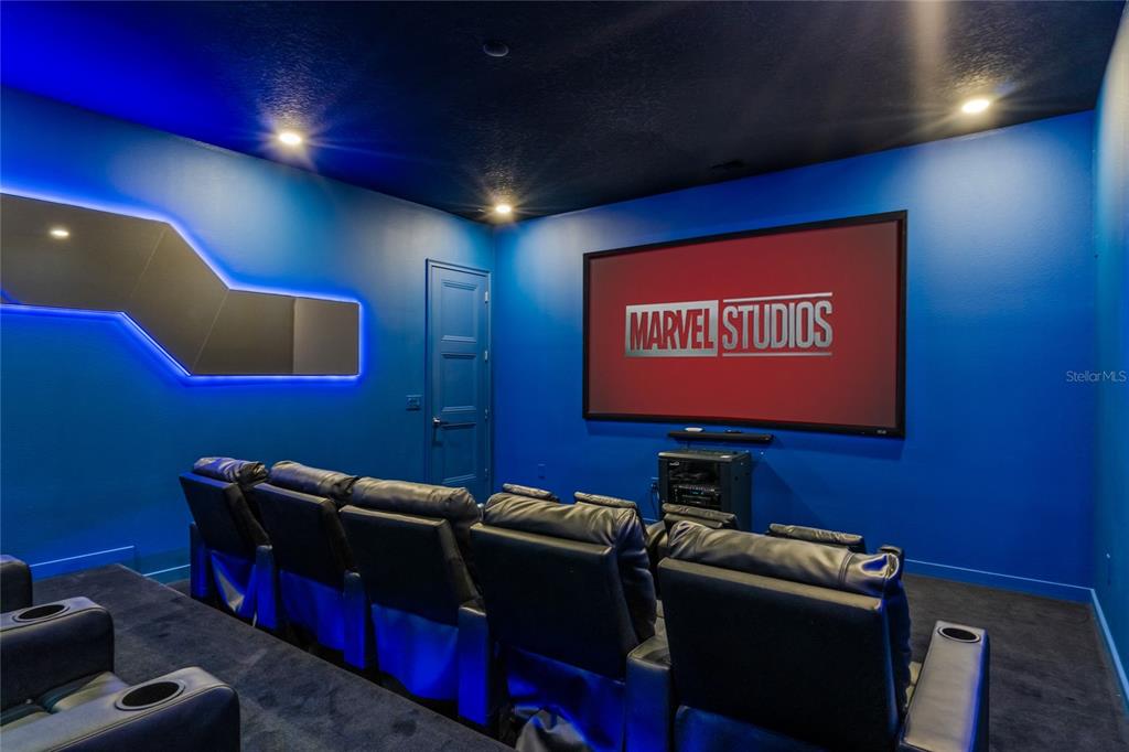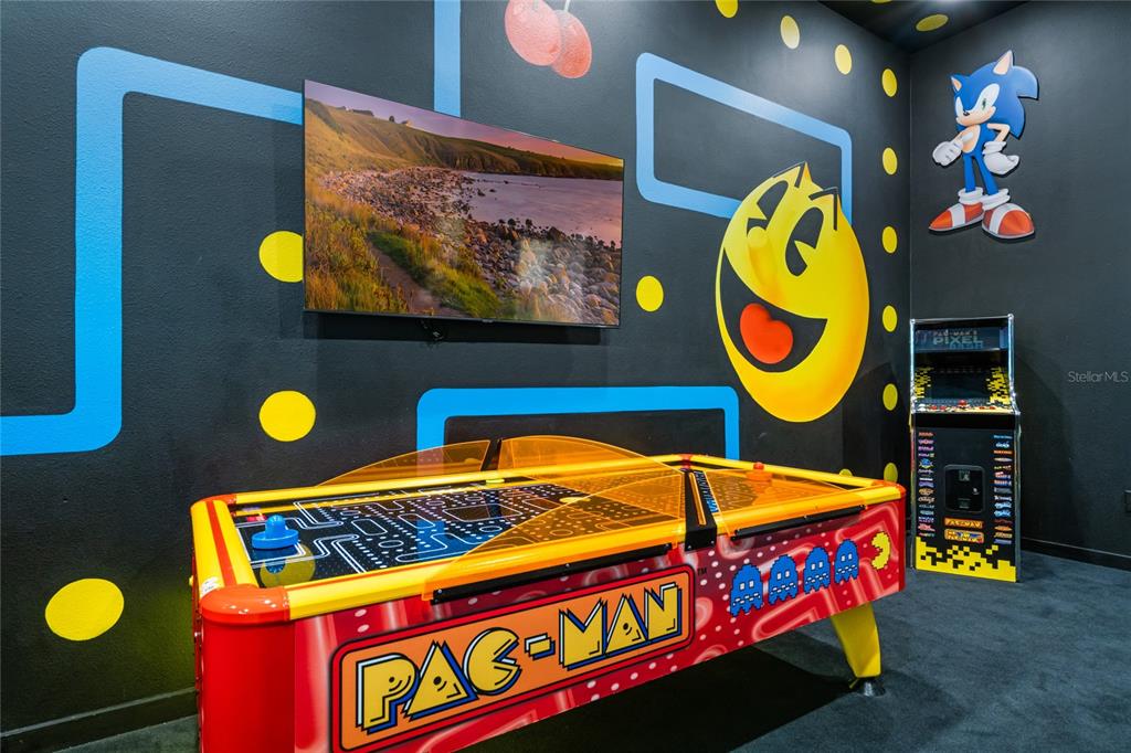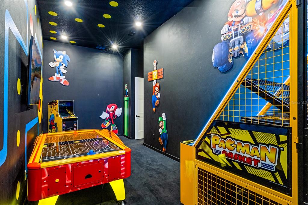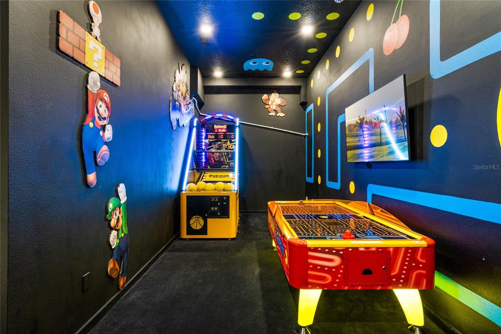 The exquisite pool home of 6542 SF at Villatel Village is truly impressive! The open concept layout with high ceilings and an abundance of natural light creates a welcoming atmosphere, the spacious great room & gourmet kitchen with a center island is perfect for gatherings. The inclusion of three Disney-themed bedrooms, a movie theater, a gym, a Pac-Man game room and a oversized loft with assortment of games and entertainment adds a delightful touch for all guests. Solterra Resort offers a clubhouse, water park with an oversized resort pool, lazy river, and water slides, tennis & basketball courts, hiking trails and more.