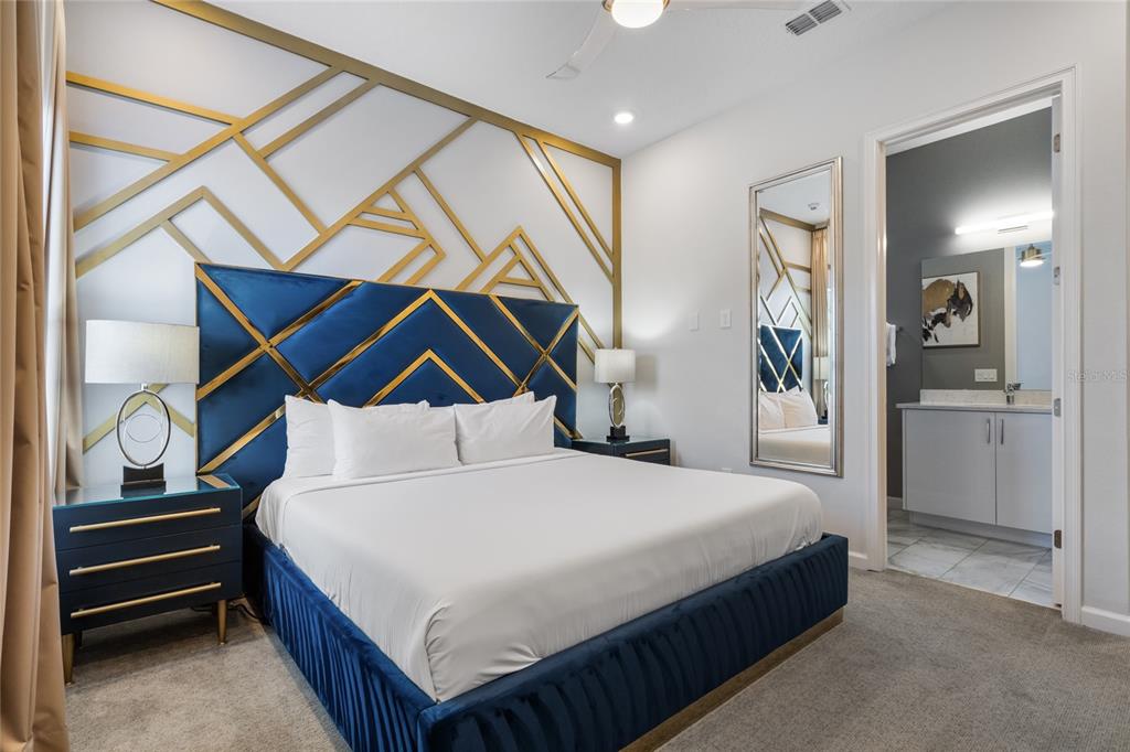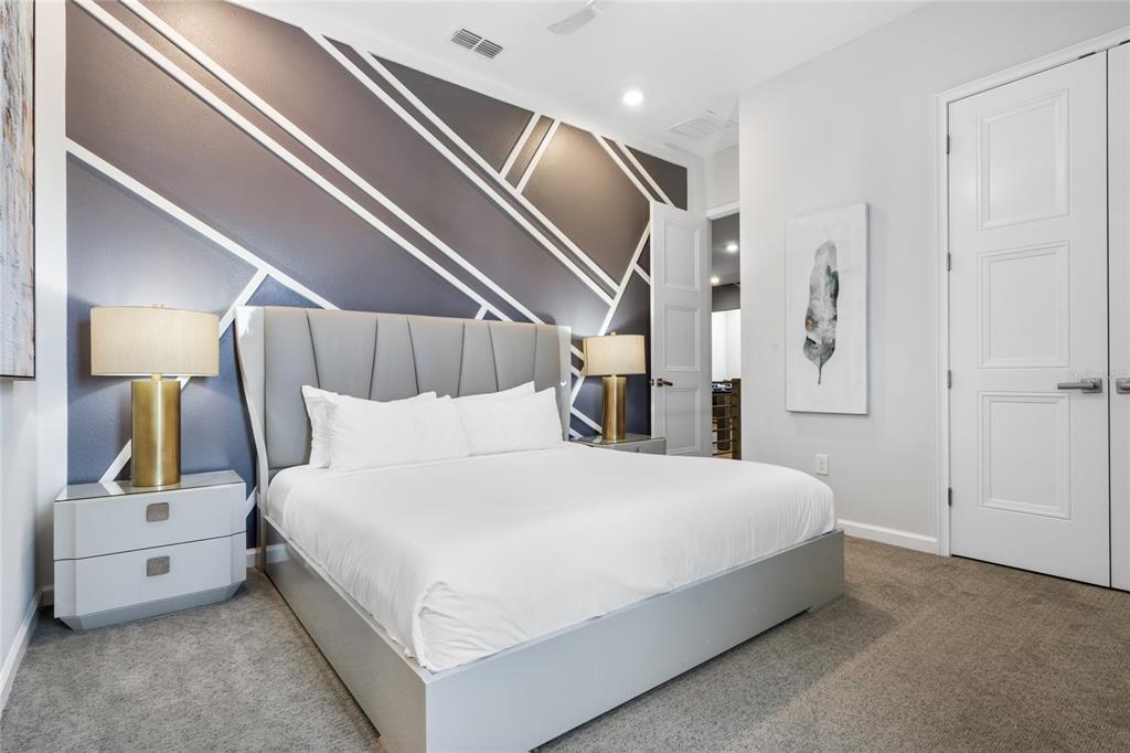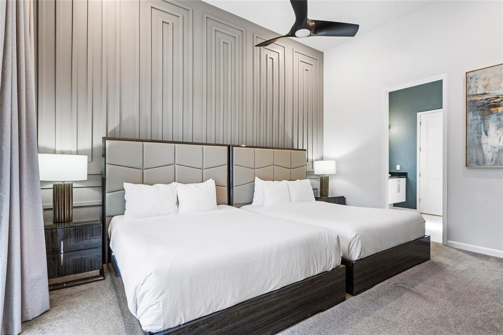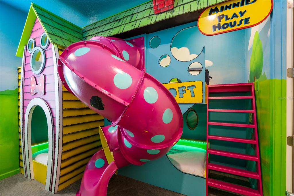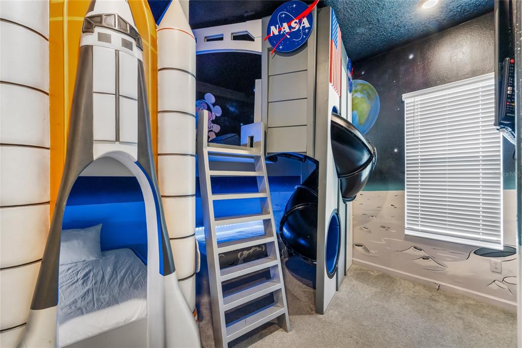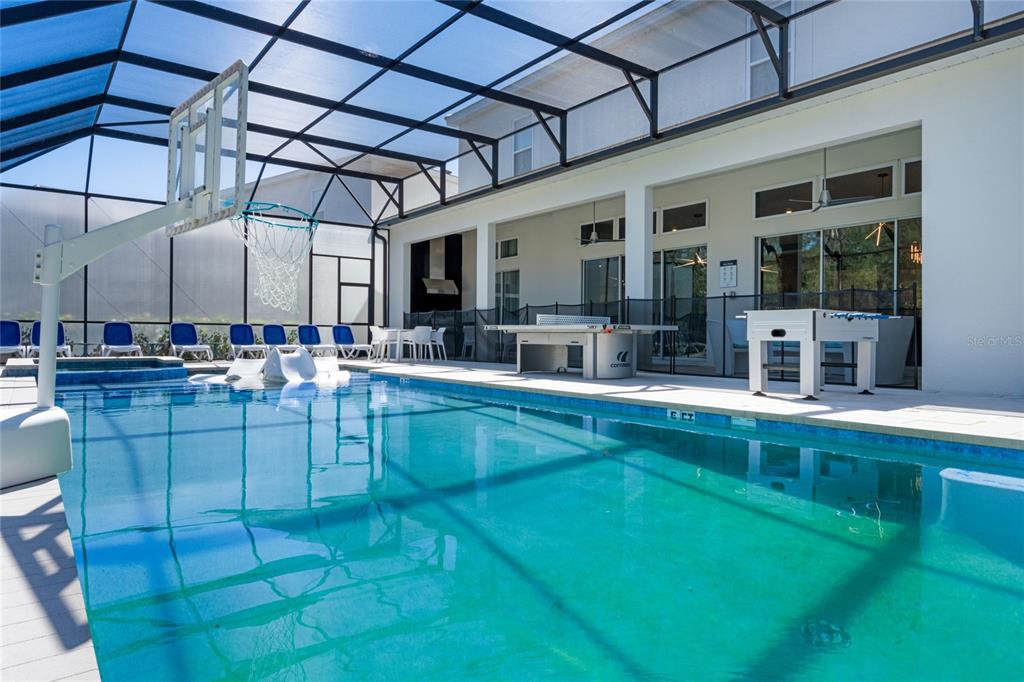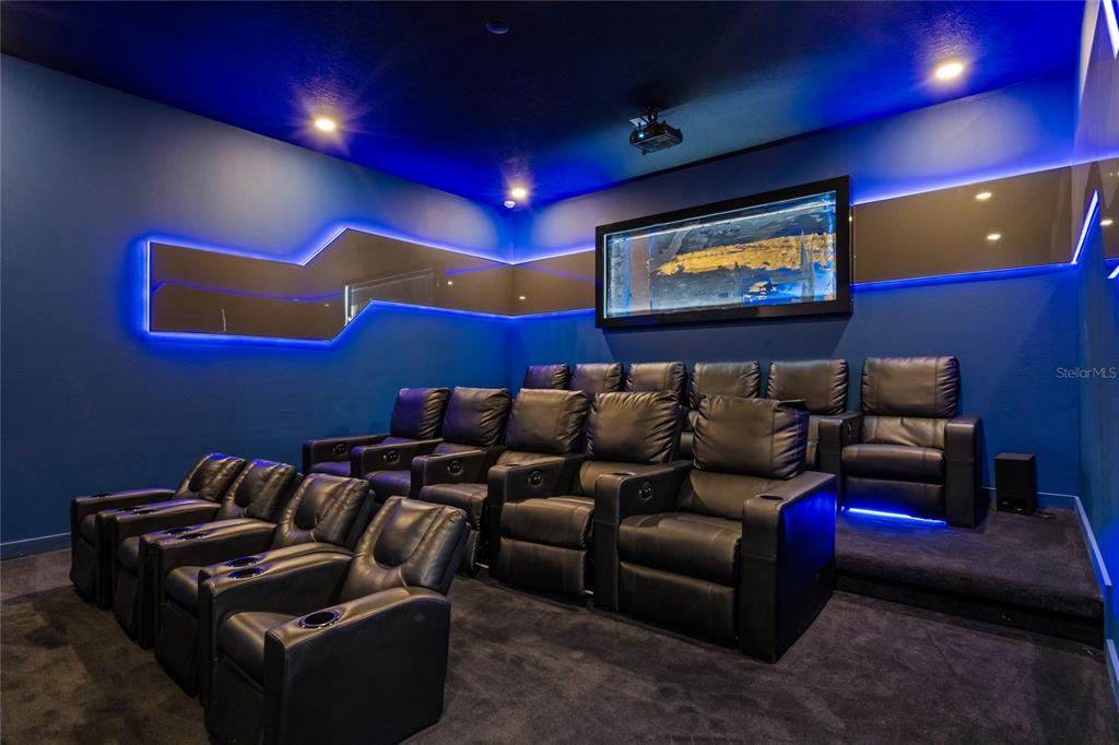 The exquisite pool home of 6542 SF at Villatel Village is truly impressive! The open concept layout with high ceilings and an abundance of natural light creates a welcoming atmosphere, the spacious great room & gourmet kitchen with a center island is perfect for gatherings. The inclusion of three Disney-themed bedrooms, a movie theater, a gym, a Pac-Man game room and a oversized loft with assortment of games and entertainment adds a delightful touch for all guests. Solterra Resort offers a clubhouse, water park with an oversized resort pool, lazy river, and water slides, tennis & basketball courts, hiking trails and more.