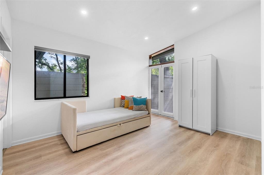 The primary suite features a spacious walk-in shower with rain fixtures. Bedrooms two and three share a Jack-and-Jill bathroom with a freestanding soaking tub. Two bedrooms include walk-in closets and French doors that open directly to the backyard.